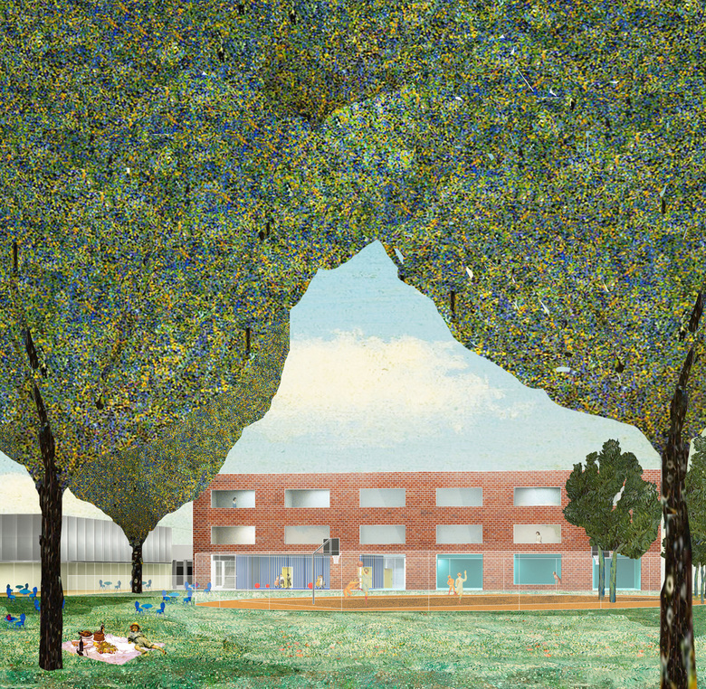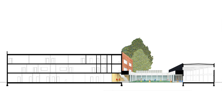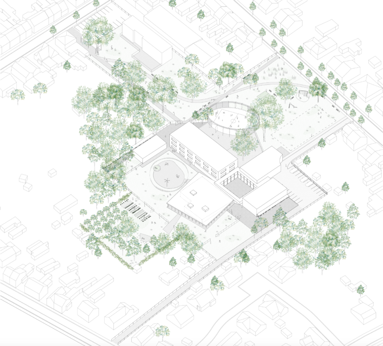Our main goal was to endow this empty lot and its surrounding neighbourhood with a sense of community, whilst staying sensible about the amount of open space we occupy. How can this new school, with its own community during the day and its open doors after-hours, the existing sports hall and the surrounding public park function as one communal organism in a safe and playful way?