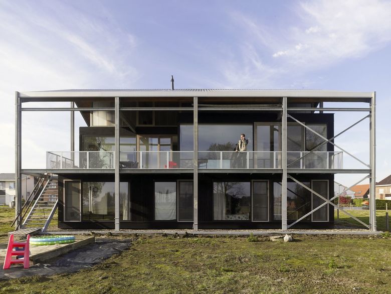 De tweede ontwerpzet introduceert de welgekende Vlaamse staltypologie: een industriële “ready-made” stalen structuur wordt in een mum van tijd opgetrokken. Onder deze herkenbare typologie stapelt de bouwheer zijn eigen woonvolumes. Dat rekt het bouwproces enigszins maar het engagement van deze zelfbouwende familie is intenser en intrigerender dan een “normaal” bouwproces.