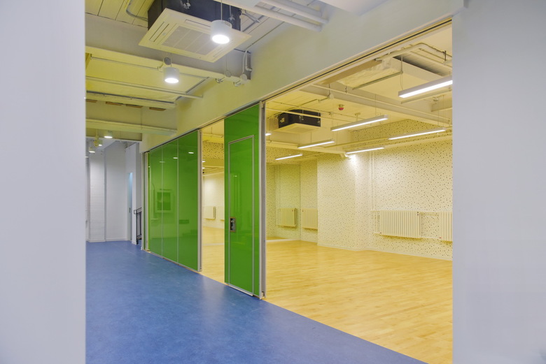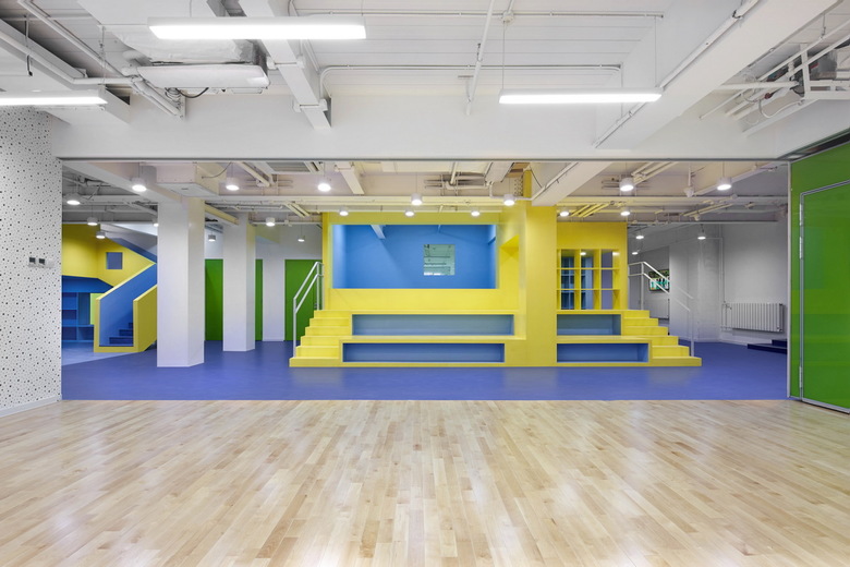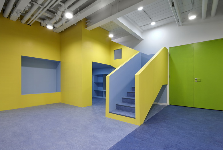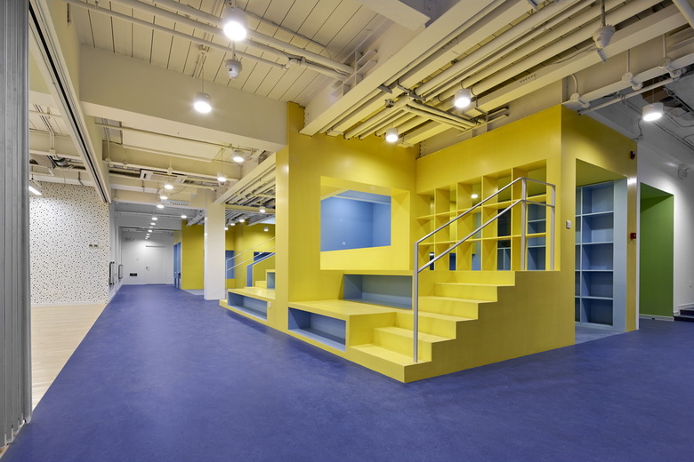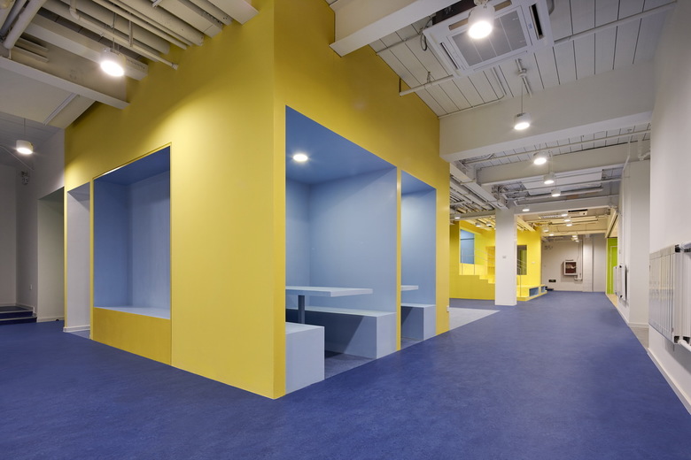 明亮活泼的明黄色作为多功能活动空间的主题标志,辅以中性的灰蓝色,颜色的变化使空间富有层次感。