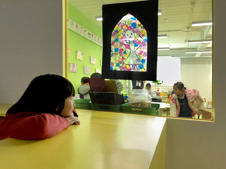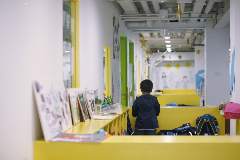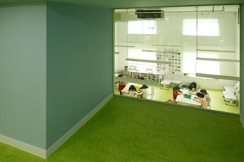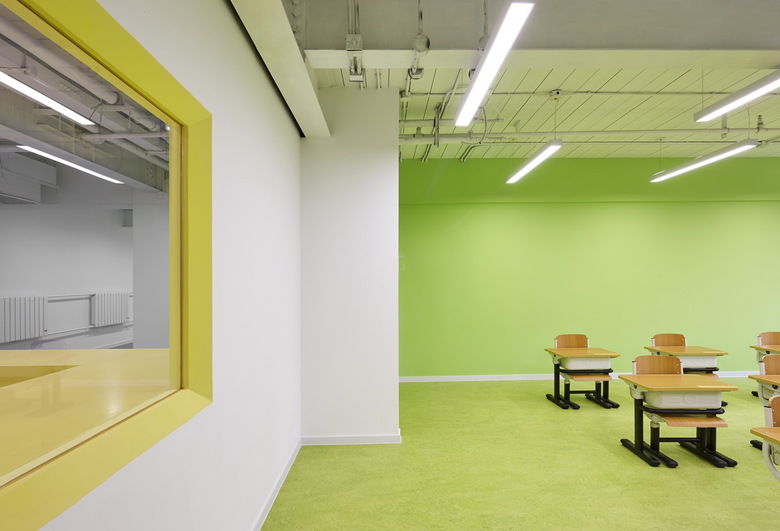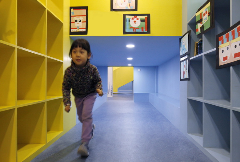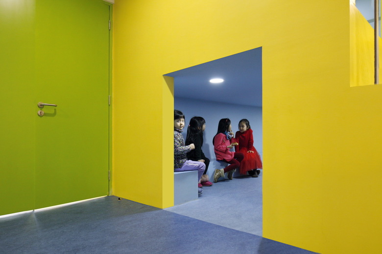 室内空间的设计充分体现了教学,办公,玩耍的三方碰撞。走廊的多功能区域与教室空间之间设置了许多高低相间的小视窗,让不同空间中的行为活动产生视觉联系与互动。鼓励孩子们的好奇心,攀上爬下,钻里望外,激发探索。