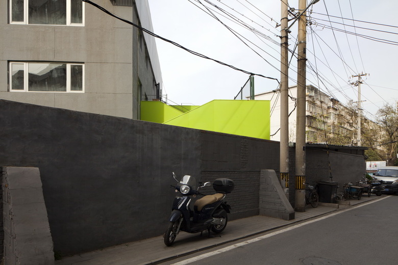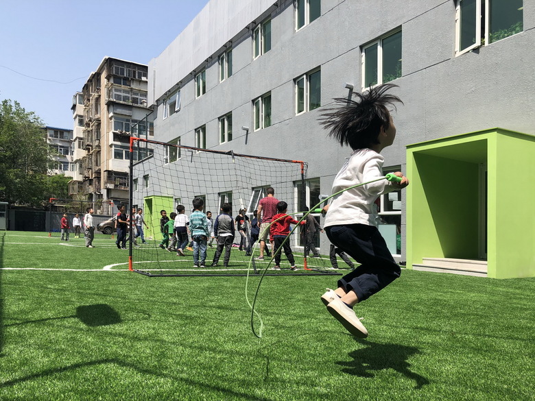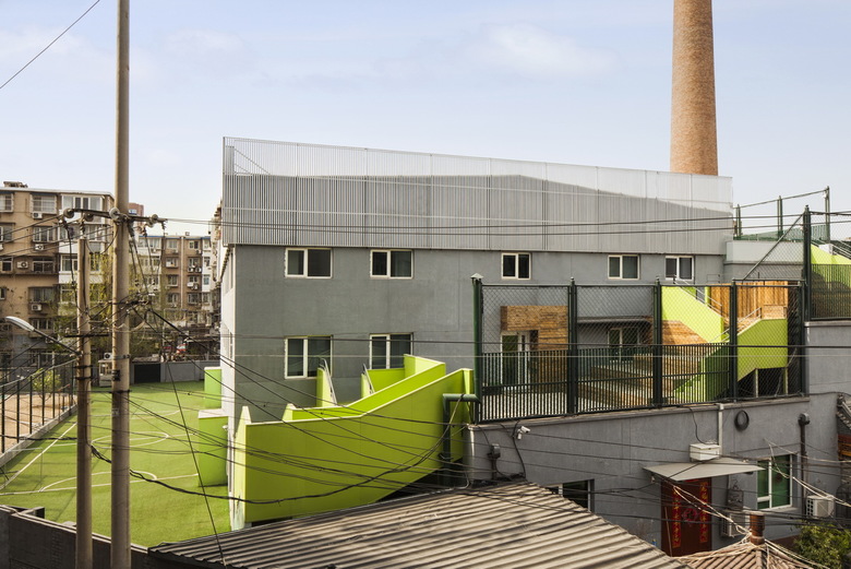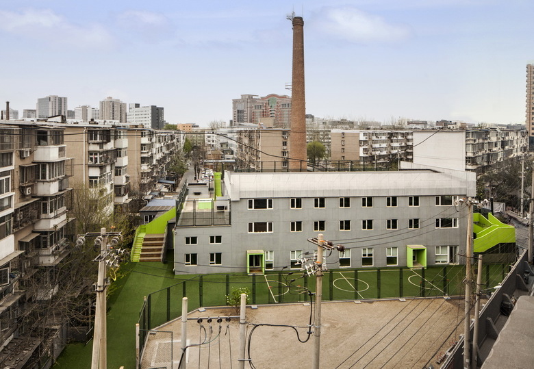 室外空间运用了一土的标志色——绿色形成一条环形的运动地带,将地面层的活动空间以及四个原有的屋面活动平台串联起来。环状跑道总长约,及奔跑,攀爬,游玩,休憩,及小型表演聚集活动于一体。