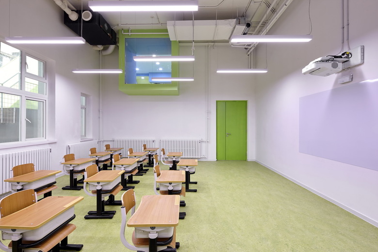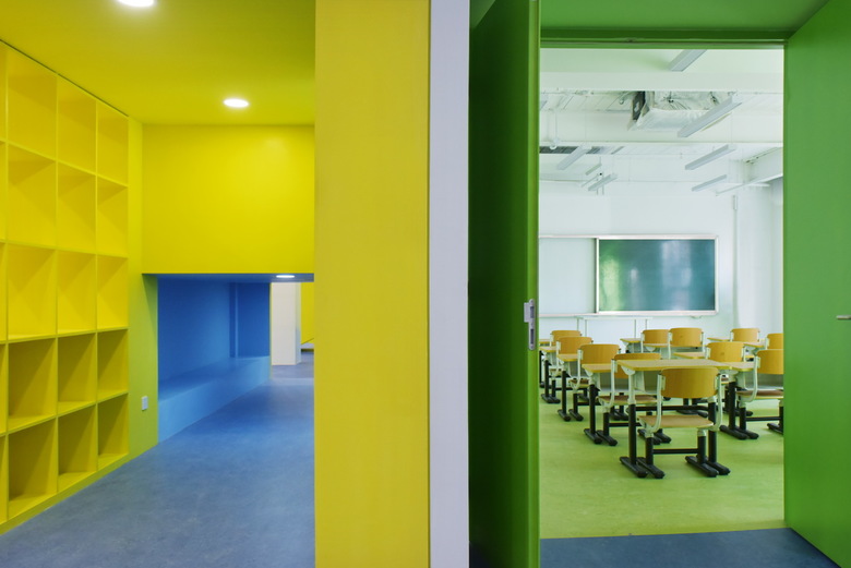 Crossboundaries移除了原有的“中间走廊,两边房间”的办公室格局,对现状结构做了必要的加固。新的空间格局将班级教室安排在有自然采光的一面,将舞蹈美术实验室等特殊教室安排在无采光的一边,同时在各层的走廊空间引入了一些体验丰富的多功能体块,为孩子们提供教室以外的社交与活动空间,让教育走出教室,发生在校园的各个角落。