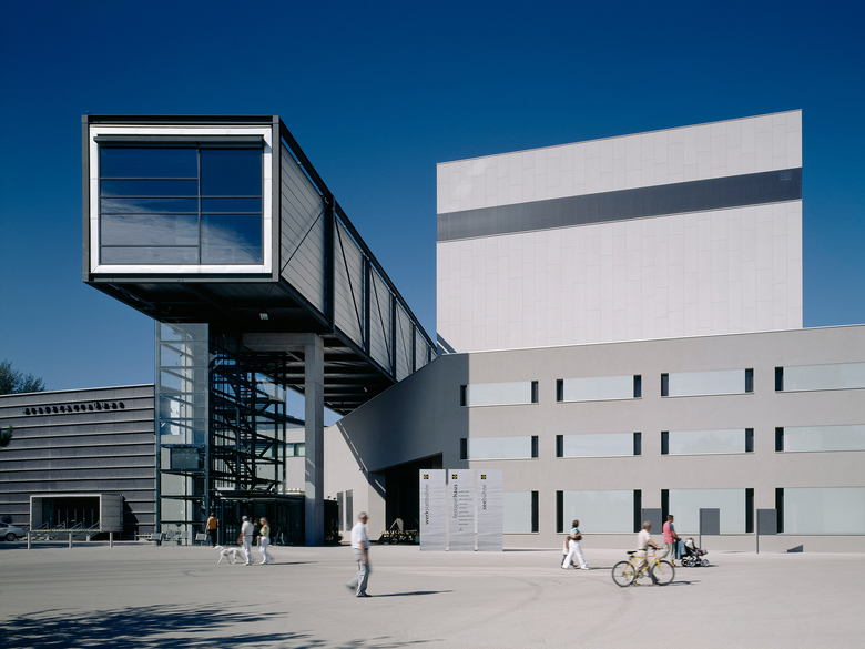 Die Transformation des eher verschlossen wirkenden Gebäudes von 1979 in eine vielgestaltige, einladende Anlage entspringt nicht formalistischer Spielerei, sondern durchdachter Entflechtung betrieblicher Problemknoten. Zwei auffällige, überdimensionale, über dem Gebäude schwebende Riegel gliedern den weitläufigen Komplex in drei Hauptabschnitte: Studio- und Werkstattbühnenbereich, Großer Saal sowie Seetribüne. Rund um die Skulptur von Gottfried Bechtold wurde auf der Vorderseite ein neuer, öffentlicher Platz mit Ausblick auf den See geschaffen.