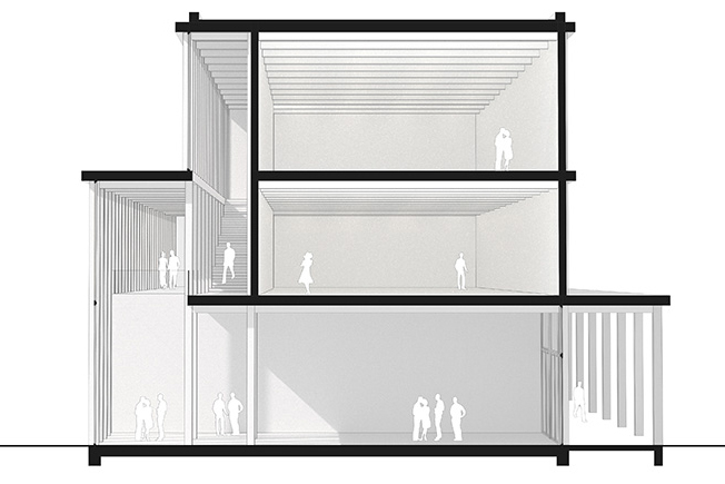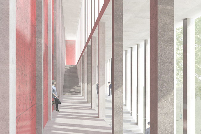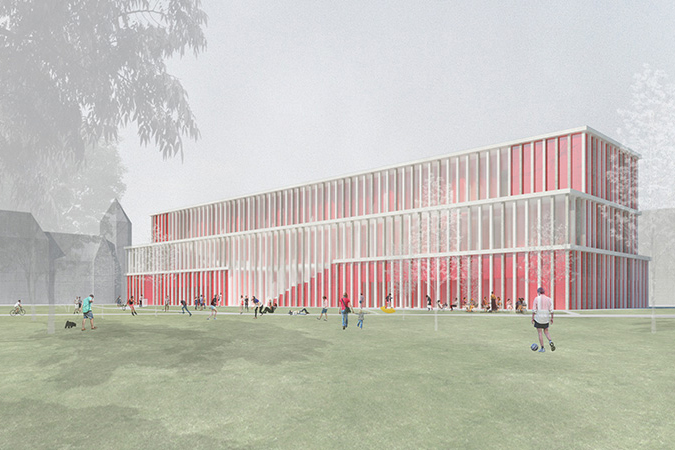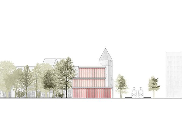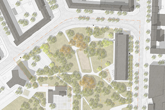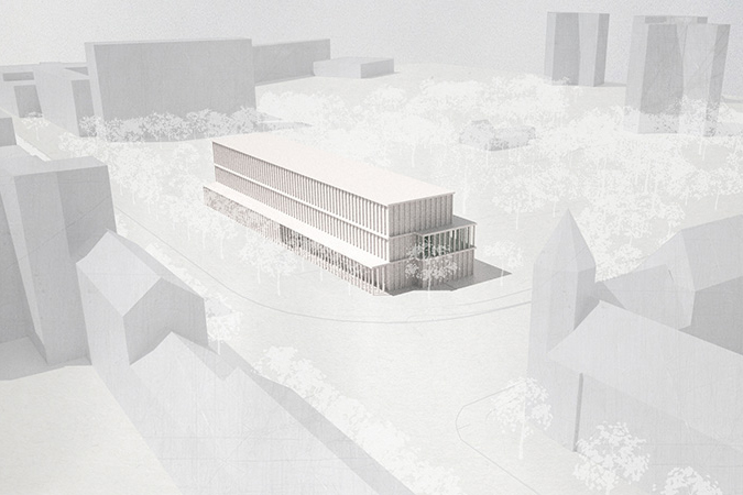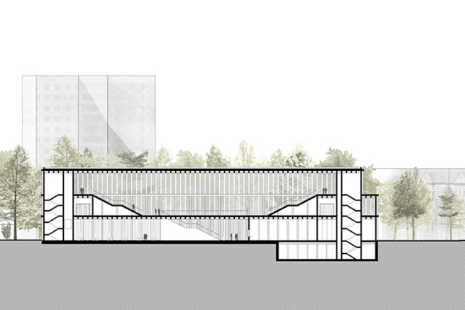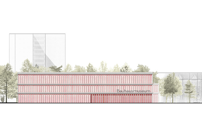 Das Bauhaus Museum präsentiert sich als filigranes, dreigeschossiges Bauvolumen am nordöstlichen Rand des Stadtparks. In Anlehnung an das alte Stadtgefüge Dessaus vor dem Zweiten Weltkrieg wird damit ein prominenter Standort neu besetzt. Mit seiner langgestreckten Form fasst das Gebäude den Strassenraum entlang der Kavalierstrasse und definiert gleichzeitig einen klaren Übergang zwischen Stadt und Park. Der differenziert gestaltete «Gebäudekopf» an der Kreuzung Friedrich-/ Kavalierstrasse sowie der leichte Rücksprung aus der Strassenflucht heben das neue Museum als besonderen kulturellen Ort im Stadtraum hervor. Dank der kompakten Bauweise beschränkt sich das Mass der Interventionen im Park auf kleine Eingriffe, die das Museum in der Umgebung verankern.
