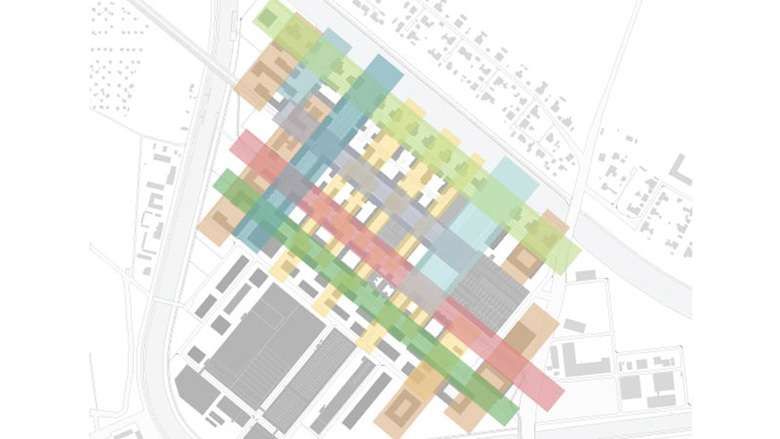 Das städtebauliche Regelwerk von Duplex Architekten in ARGE mit Bartscher Architekten wird zur Umsetzung empfohlen. Basis des Entwurfs ist das Prinzip der Heterogenität. Aufbauend auf der Vielfalt von Bauträgern, Autoren und stadträumlichen Situationen suchen wir nach einem gemeinsamen Nenner, der das Ganze zu einer gestalterischen Einheit verindet: Diversité dans l’Unité! Betrachtet wird nicht nur der Block oder Baukörper, sondern der urbane Zwischenraum, also Straßen, Gassen und Plätze. Baufeldübergreifend gelten individuelle Gestaltungsregeln für diese «Bänder». So können ihre spezifischen Eigenheiten gestärkt werden. Vorgegeben wird, dass alle Gebäude mit ihrem architektonischen Ausdruck einen Bezug zur industriellen Vergangenheit des Areals aufnehmen. Die gestalterischen Mittel sind frei und können aus ganz unterschiedlichen Themen abgeleitet werden, z.B. aus der Materialität, der Volumetrie, Konstruktion, der Physiognomie oder dem Farbkanon. Jedes Baufeld muss einen Beitrag an die Nachbarschaft leisten, wie z.B.: KiTa, Pflanzgarten, Werkstätten.
