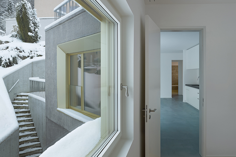 Für ein Mehrfamilienhaus in Baden entwerfen wir innerhalb einer schmalen, dreieckigen Parzelle am Hang einen kubischen Solitär, der dem gebauten Kontext trotzt und sich im Hang verankert. Es gibt kein Treppenhaus, vielmehr sind drei Wohnungen derart gestapelt, dass sie jeweils einen eigenständigen Zugang erhalten. Jede Wohnung basiert auf einer kreuzförmigen Grundstruktur, diese wird jedoch individuell interpretiert: Im Erdgeschoss entsteht eine Familienwohnung mit grosser Wohnküche, Terrasse und Garten. Darüber befindet sich eine Loftwohnung mit herrlichem Ausblick in das Limmattal, und die Dachwohnung basiert auf einem Raum-zu-Raum-Prinzip mit privatem, innen liegendem Patio.