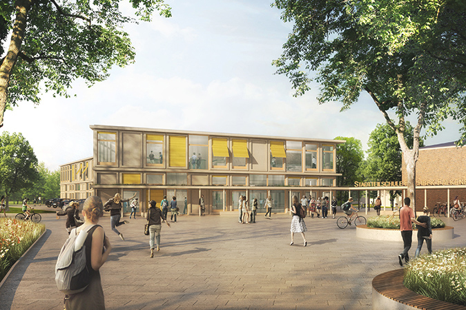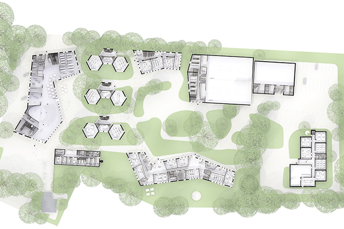 Als zweigeschossige Pavillonbauten ordnen sich die Gebäude dem Park mit seinen Bestandsbäumen unter. Gleichzeitig passen sie sich durch die geringe Höhe harmonisch in das dörfliche Umfeld ein. Auch die Kubatur des Forums fügt sich in Ausbreitung und Höhe gut in die Umgebung ein, indem es sich mit seiner Schmalseite zum Stadtraum öffnet. Diese schafft eine neue, explizite Adresse: Es entsteht ein großzügiger Platz, der als Angebot für den Stadtteil als Quartiersplatz die Eingangssituation klar definiert und so die Schule stärker in ihr soziales Umfeld einbindet.