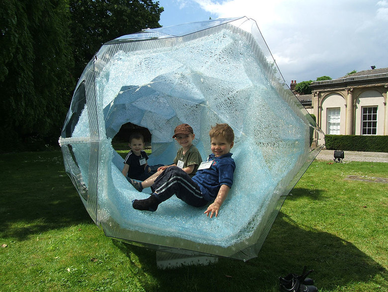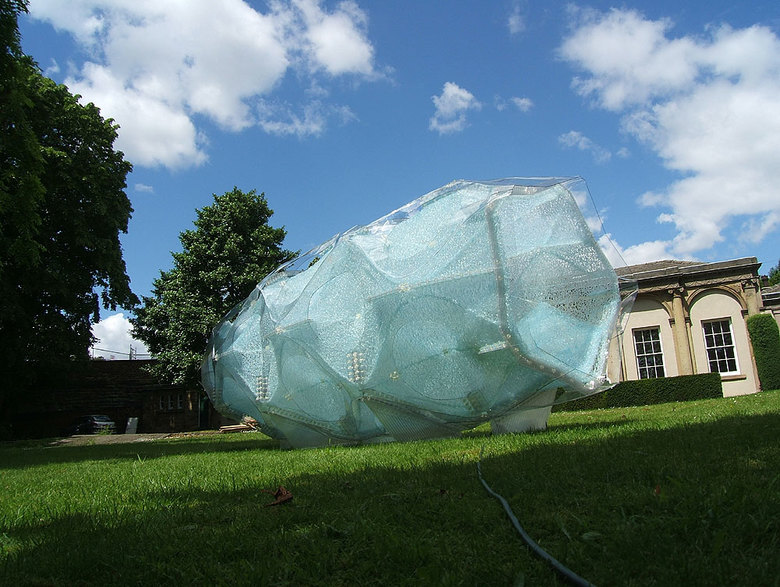 《Aqua-scape》とは、水のように柔らかく不定形で、クラゲのように骨の無い建築を目指して、全てをプラスチック素材のみを用いてセルフビルドした実験建築です。折り紙のように、一枚のシートを折り曲げたときにできる形で構成されています。2006年に制作したこの作品は、若手建築家に与えられるイギリスの賞である「The AR Award for Emerging Architecture 2006」に入選し、国内外、特に海外の雑誌メディアに多数掲載されました。これらをきっかけとして、イギリスに招かれ、わたしたちにとっては、はじめてとなる作品展が開催されることになりました。