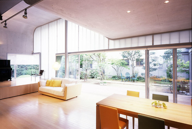 設計に際して要望されたのは、夫婦と子供3人からなる5人の家族がみな、楽器を演奏するという趣味を持っているため、家族がいつも一緒に過ごせるような場所に楽器演奏の練習スペースをつくって欲しいということでした。この練習スペースを、楽器の演奏だけでなく、家族が思い思いに時間を過ごせる場所という意味からサロンと名づけ、リビング・ダイニングと空間的に一体となるような位置に計画しました。サロンは、床レベルを50cm上げることで領域を分け、舞台のような効果を狙っています。