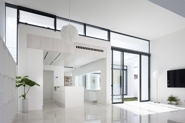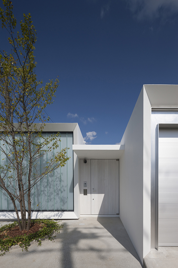 美術館のような住宅を建てたい。」という、絵画鑑賞と絵を描く事が趣味の建築主のための住宅です。それぞれの空間に飾られた所蔵作品を見て行くと、まるで美術館の展示室のように住宅を一筆書きで巡ることができます。外部からの視線を遮りたいという建築主の要望を満たしながら、風や光が抜け、シークエンスと重層性のある空間構成になっています。