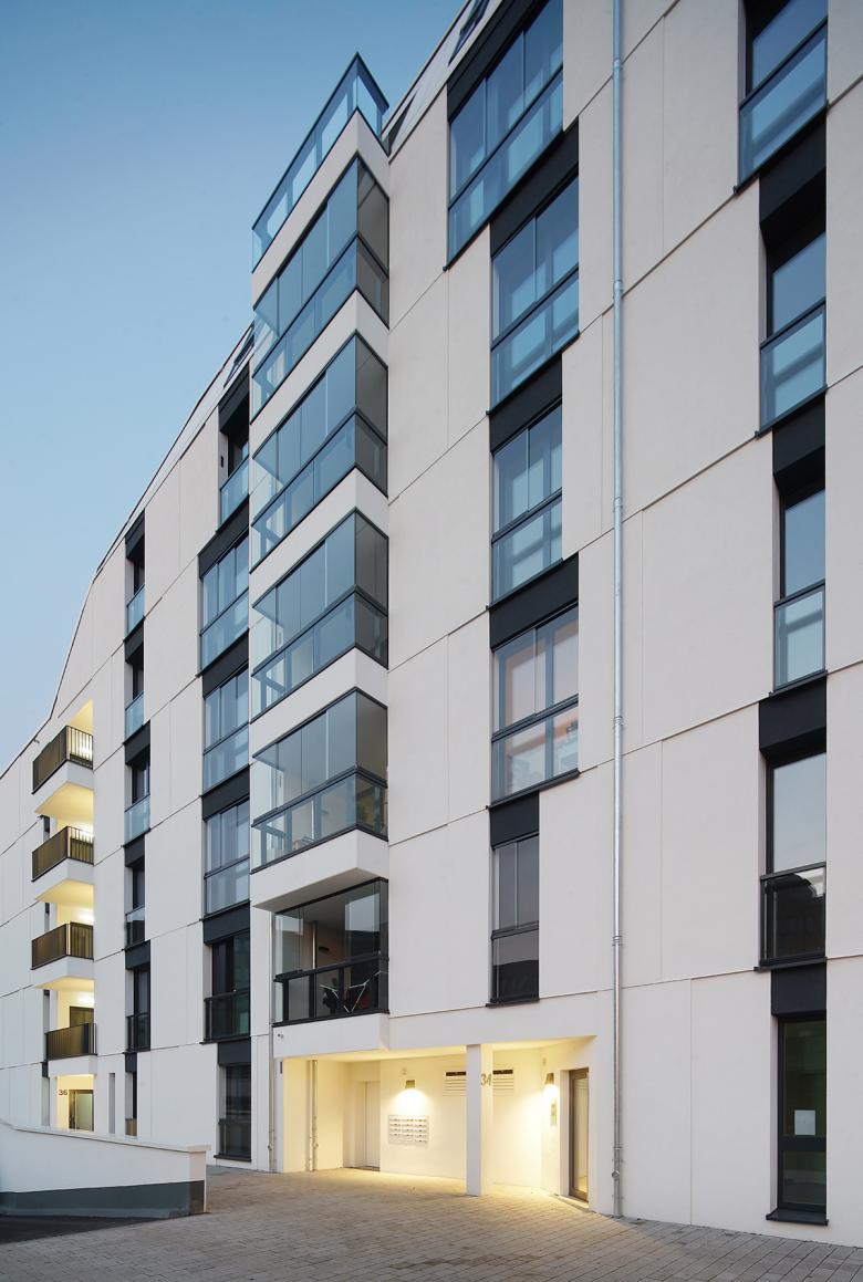 In der äußeren Gestaltung spiegelt sich bereits der hohe Anspruch wieder, der sich in der Grundrissplanung und der Ausstattung bestätigt. GERBER 34 wird mit dem anschließenden Gebäude ein harmonisches Ensemble bilden, da dieses in derselben Architektursprache umgestaltet wird.Alle Wohnungen haben ein Maximum an Freiraum mit mindestens einer Terrasse, Dachterrasse oder einen Balkon, die Erdgeschoss-Wohnungen mit Privatgärten. Viele der "Freiräume" sind verglast, die meisten nach Süden oder Westen ausgerichtet.