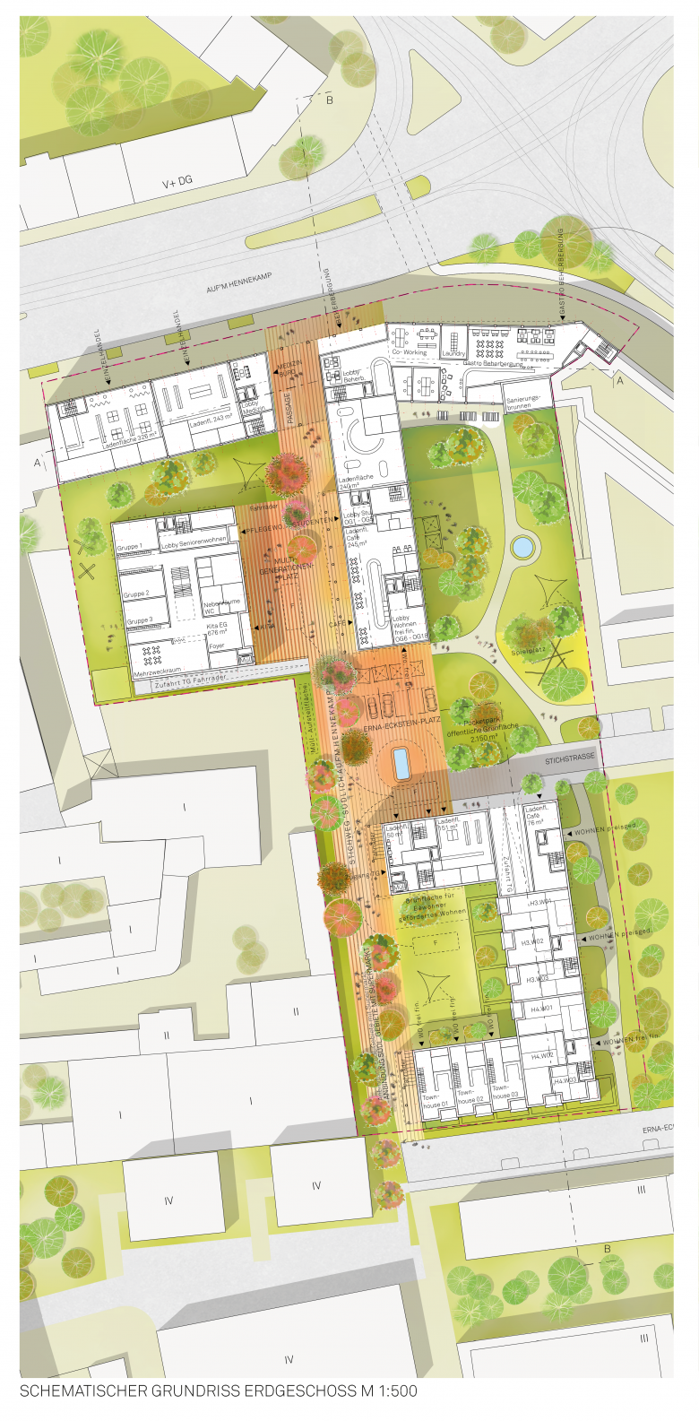 Die "Grüne Mitte Auf´m Hennekamp" repräsentiert eine nachhaltige städtebauliche Vision, die Urbanität, Grün und soziale Vielfalt vereint.