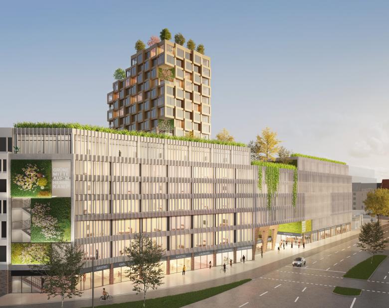 Der neue Stadtbaustein bietet sowohl geförderte-, als auch frei finanzierte Wohnungen, Seniorenwohnungen und Studierendenapartments. Medizinische Einrichtungen, Co-Working-Bereiche und eine Kita ergänzen den Nutzungsmix. Grüne Innenhöfe sowie öffentliche Parks und Plätze dienen als Treffpunkte.