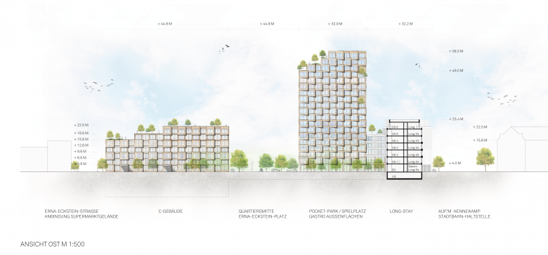 „Das Konzept greift zur Straße Auf'm Hennekamp die vorhandenen Strukturen auf und bildet mit einem Blockrand den Schallschutz zur Entwicklung weiterer Wohnungen im Innenbereich. Dort kann dann eine grüne Innenwelt mit großzügigen Freiräumen, einem prägnanten Hochpunkt und zwei weiteren markanten Gebäuden entstehen. So wird eine Balance zwischen einer angemessenen Dichte und attraktiven Grünräumen für die künftigen Bewohnerinnen und Bewohner und die gesamte Nachbarschaft erreicht“.