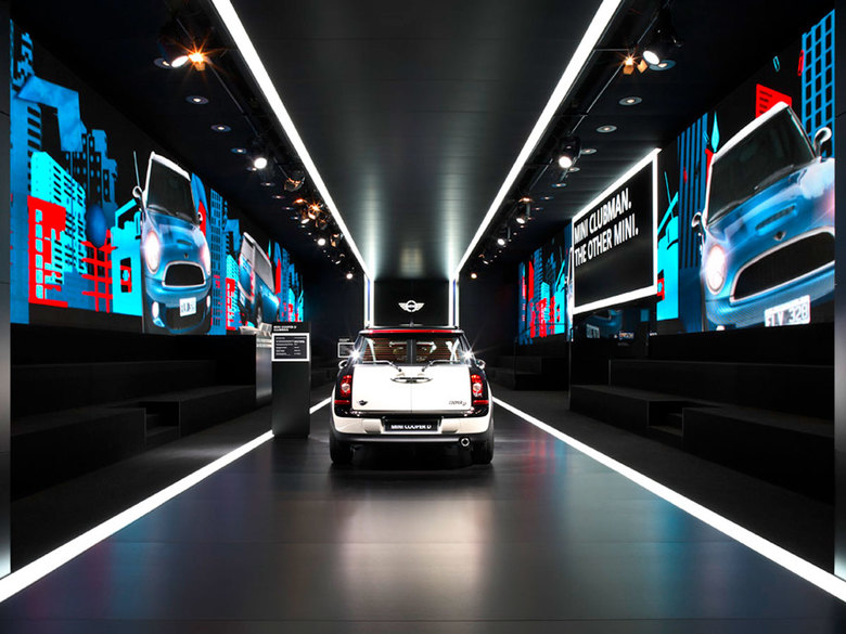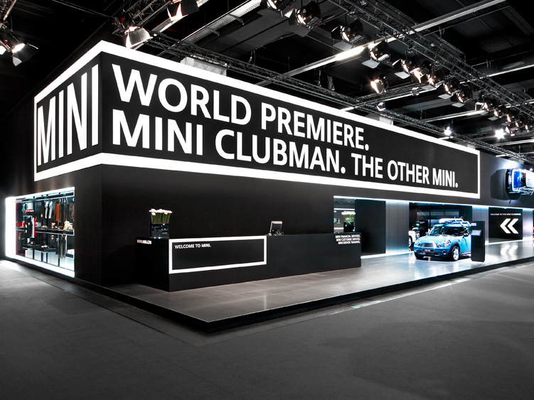 Der Messeauftritt fokussiert die Weltpremiere des MINI Clubman. Es wird eine stilbildende sich an Kunst, Mode, Clubbing orientierende Markeninszenierung realisiert. Der Gebäudekubus greift die Länge des Premierenfahrzeugs auf und kommuniziert durch seine textile Materialität im Innen und Außen, eine Referenz an Mode. Im Innenbereich entsteht ein perspektivisch überhöhter Inszenierungsraum, mit dem „MINI Clubman Catwalk“ als Zitat aus der Modewelt, als zentralem Element.