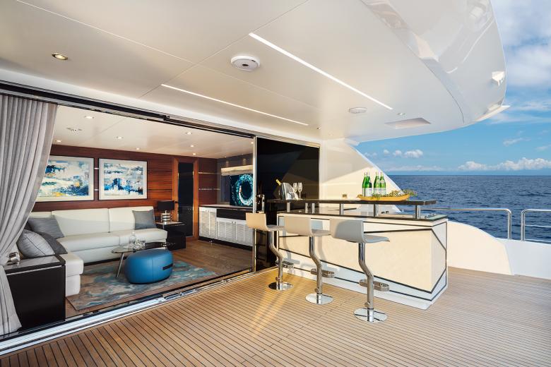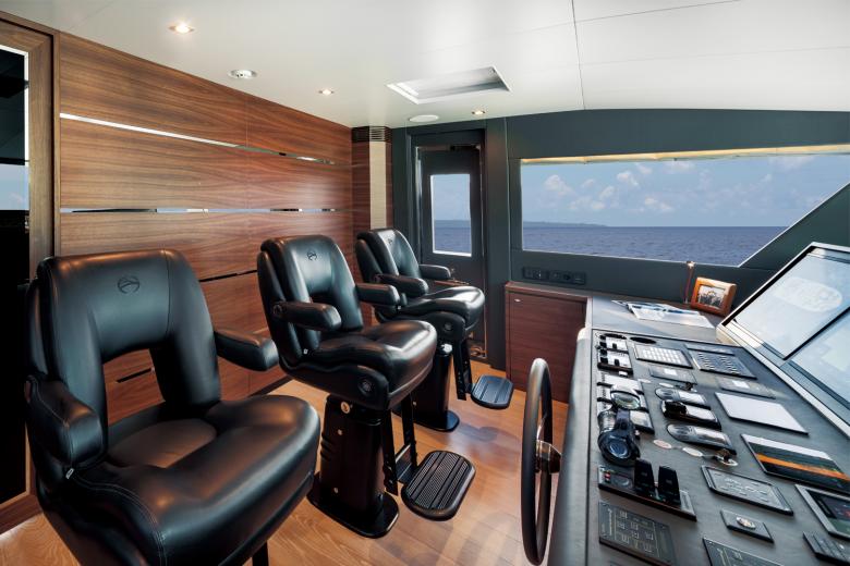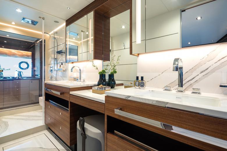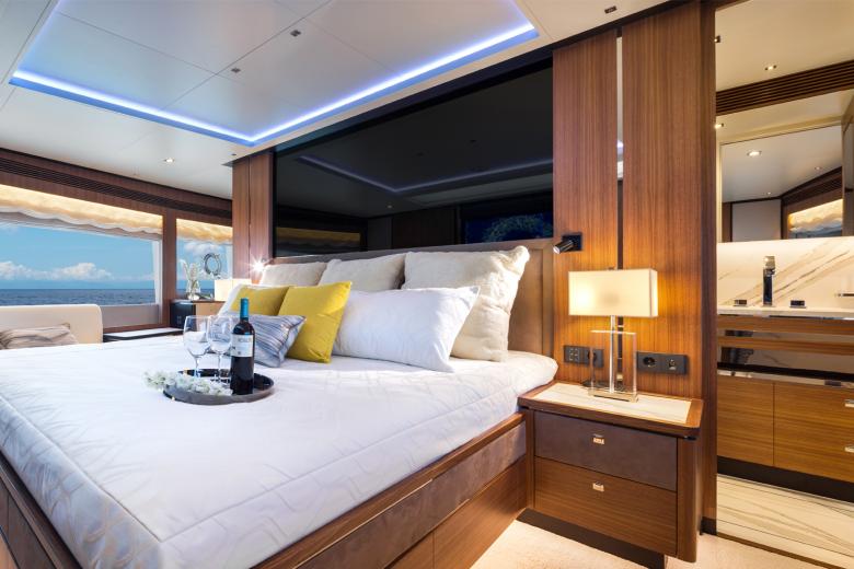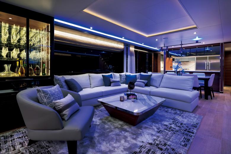 Das Interior der Yacht überzeugt durch ein diskretes Design und hochwertige Ausstattung aller Bereiche, die neueste technische Funktionen – wie beispielsweise Glastrennwände deren Durchsicht von transparent zu transluzent steuerbar ist oder die vielseitigen Funktionen des KNX Systems – mit einer modern durchdachten Ästhetik kombinieren. Dabei legte das Designteam Wert auf eine kühle Gestaltung, die im Gegensatz zu den vorherigen Modellen nicht auf warmen Holzfarben und Goldtönen basiert, sondern nun auf dunklem Holz, glänzendem Edelstahl und schwarzen Glasflächen. Sorgfältig platzierte Akzente durch weiche Textilien wie Wildleder oder hochflorige Teppiche brechen das schlichte Design auf und sorgen in Kombination mit einzigartigen Beleuchtungslösungen, wie beispielsweise in die Decke integrierte Lichtbänder, für eine wohnliche Atmosphäre. Durch warme Lichtfarben wird der Yacht somit ein strahlender Glanz von innen verliehen – ohne dafür wie bisher mit viel Marmor und Gold zu arbeiten.