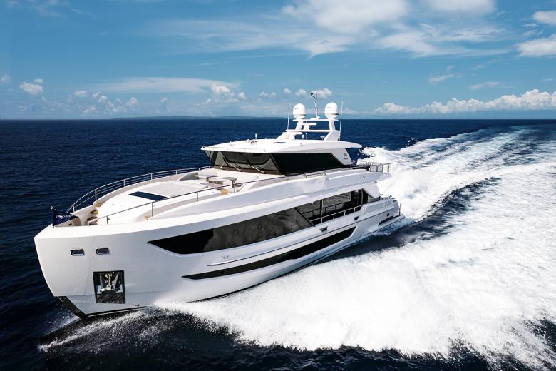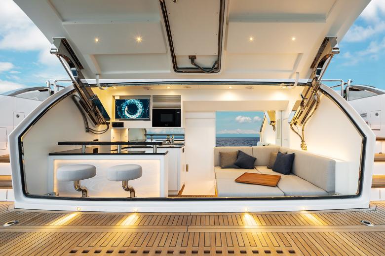 Eine dieser neuen Motor-Yachten für ein modernes Klientel ist die FD90 Hull 22. Die Yacht wurde mit einer geschlossenen Skylounge und einem separaten Steuerhaus ausgestattet, das über eine Schwebetreppe zugänglich ist. Im hinteren Bereich der Skylounge befindet sich eine Bar, gefolgt von einem großen Außenbereich mit freistehenden Möbeln auf dem Bootsdeck. Über begehbare Seitendecks gelangt man zu einem zusätzlichen Loungebereich auf dem Vordeck. Gäste betreten die moderne Yacht jedoch zunächst über ein geräumiges Achterdeck im Zwischengeschoss mit einem großzügigen und wohnlichen Sitzbereich im Freien, gefolgt von einem loftartigen Hauptsalon mit Wohn-, Ess- und Multimediabereich. Die zeitgenössische Inneneinrichtung ist durch viel Walnussholz, schwarzes Glas und schwarze Lackoberflächen geprägt. Ebenfalls auf diesem Hauptdeck befindet sich eine großzügige Master-Suite mit privatem Bad. Im Unterdeck, das vom Salon mit einer innenliegenden Treppe zu erreichen ist, gibt es zwei weitere Queen-Size-Kabinen sowie eine umwandelbare Twin/VIP-Kabine und alle benötigten dienenden Funktionen. Achtern des Maschinenraums liegen auf dem Unterdeck vier Mannschaftsquartiere sowie ein komfortabler Beach Club mit Bar und Sofabereich.