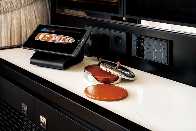 Das Herz der Yacht ist jedoch der großzügige Wohn- und Aufenthaltsbereich auf dem Mitteldeck. Raumhohe Fenster und Glasschiebetüren, die den Salon mit den umlaufenden Decks auf beiden Seiten verbinden, weiten den Blick in den Außenraum. Die großzügige Galley kann je nach Wunsch vom Ess- und Wohnbereich mit einem Sichtschutz abgetrennt werden. Maßgefertigte Möbel und Einbauten sorgen für viel Stauraum. Besondere Beleuchtungseffekte sowie die Farbsteuerung des Lichts durch das KNX Automationssystem von JUNG ermöglichen es, den Salon in unterschiedliche Lichtfarben zu tauchen. Die Steuerung erfolgt entweder durch wandmontierte Taster im Design LS 990, deren Bedienung durch klare Icons besonders intuitiv ist, oder, komfortabel vom Sofa aus per App über das Tablet oder Smartphone. Gleiches gilt natürlich auch für die Steuerung aller anderen in das KNX System eingebundenen Technikfunktionen wie die Verschattung, die Klimaanlage oder die Multimediageräte.