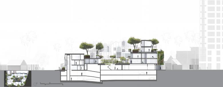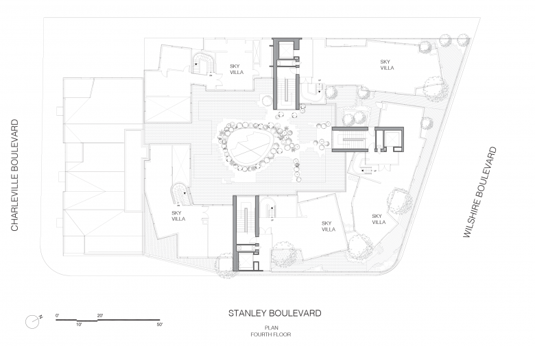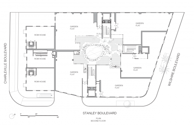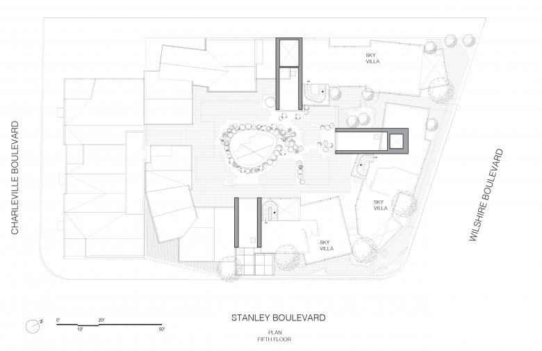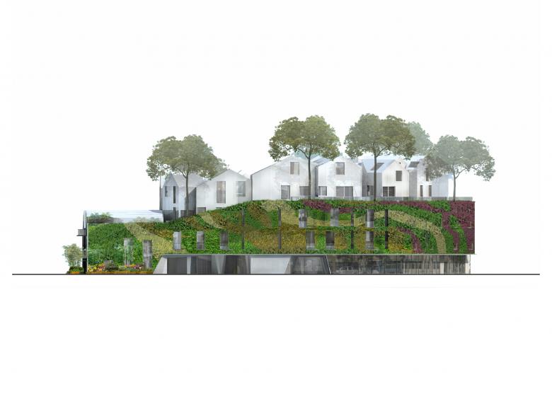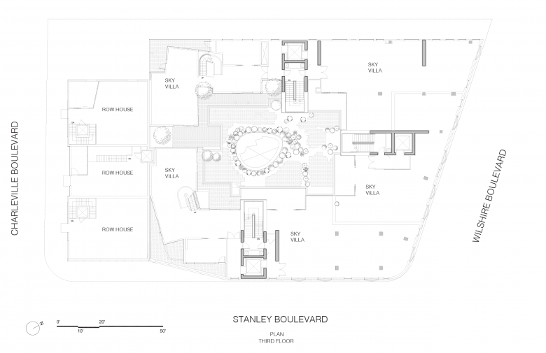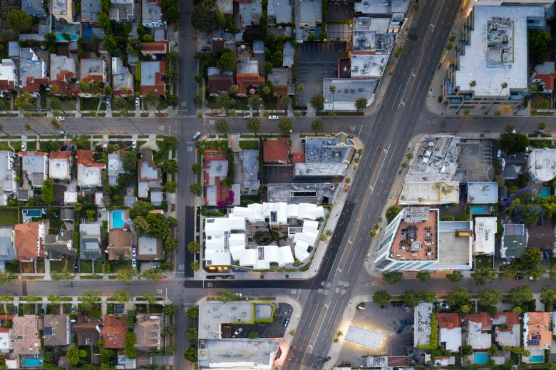 “山丘庭院”是一个混合功能项目:一层是临街商业,18个公寓单元此起彼伏生长于绿色平台之上。层叠的白色立面、尖屋顶,和不规则的窗试图在用交错的直线条描绘出动态的画面。将洛杉矶标志性的山庄,在城市环境中复制,再在“山坡”上建立小村庄。这个画面就像卡通一样的直接和天真,甚至有些幽默。