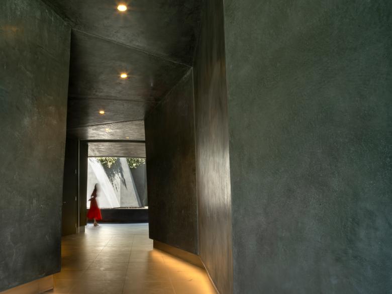 从威尔士大道转入斯坦利路即是项目的地面层行人主入口。白色建筑表皮开了个洞,昏暗的“山洞”向内连通,尽头可见光影摇曳,听到水声。往前走数步,豁然开朗,可见水景与天井连通,自然光倾泻下来。视线穿过天井,即可瞥见植物茂盛的二层庭院,以及住宅的白色山丘般错落的尖屋顶。天井犹如天空的画框,天空、阳光、自然、流水,成了一幅画,带人们远离现实。