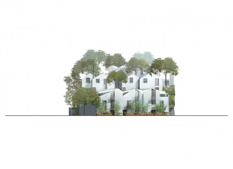 4460平方米的建筑包含了商业,2个单身公寓,8个家庭公寓,和8个跃层户型。MAD试图在紧凑的条件下尽量做到“私密性”和“社区性”两种特质。不同于传统公寓,每户都有独立的进出动线,并且结合当地住宅特点,几乎每一家都是“小社区”里拥有独立屋顶的“小房子”。