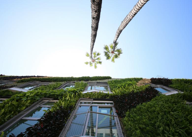建筑的立面被葱葱绿植覆盖。在常年干旱的南加州,选择如仙人掌、多肉、藤蔓等本地耐旱植物,适应当地气候,无需过多浇灌和维护即可蓬勃生长。植物本身形成建筑立面独一无二的肌理,在比弗利山市规范、整洁、一丝不苟的社区环境中注入有机自然,显得清凉且亲和。项目建成后,即成为了美国境内面积最大的绿植外墙。