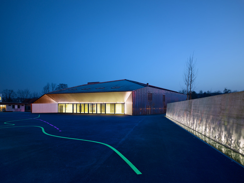 Die Festhütte ist ein fünfeckiger Zentralraum. Erinnernd an ein Festzelt, entsteht darin eine einfache, zentrierende, aber auch festliche Raumatmosphäre. Die ergänzenden Räume besetzen gleichwertig die Seiten des Saales. Der Vorplatz, der Eingangsbereich, das Foyer und der Saal mit einem grossen Aussichtsfenster zum Grünraum bilden eine grosszügige Raumfolge. Der Saal inklusive Galerie ist ausgelegt für 1200 Sitzplätze (Bankett 830 Plätze).