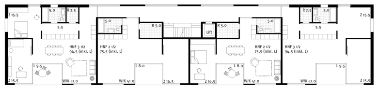 Das neue Wohnhaus fügt sich analog zu den bestehenden Alterswohnungen entlang der Hangkante in das Ensemble ein. Alle Wohnungen sind klar nach Süden orientiert und profitieren von einem atemberaubenden Ausblick auf die Berglandschaft und den See. Wohnzimmer, Loggia und jeweils ein Zimmer bilden eine räumliche Einheit, die durch die entstehenden Blick- und Raumbezüge einen erhöhten Wohnkomfort und Nutzungsflexibilität bietet. Gleichzeit erhalten die Wohnungen durch die zentrale Lage der Loggia zwischen Wohnbereich und Zimmer ihren speziellen Charakter.