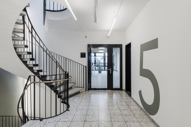 Der Gebäudekern ist mit allen nötigen Infrastrukturen ausgerüstet worden, damit alle Mieterschaften je nach ihren Bedürfnissen unterschiedliche technische Ausbaustandards wählen konnten. Der öffentliche Bereich mit der gewendelten Treppenanlage, den neuen WC’s und den allen Mietern zugänglichen Duschen mit zeitgemässen Oberflächen und Farbakzenten, unterstreichen den neuen Look des Geschäftshauses. Die erneuerten Büromietflächen überzeugen durch eine moderne und fokusfördernde Raumaufteilung. Ausgewählte warme Farb- und Lichtwelten begünstigen die Behaglichkeit der Arbeitsplätze.