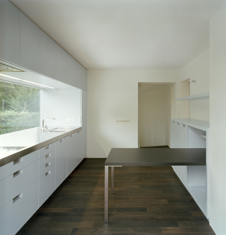 Die Küche mit einem langen Bandfenster nimmt Bezug zu den umliegenden Gärten auf. Das Wohnzimmer ist vergrössert und in seiner Detaillierung beibehalten worden.