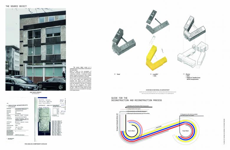 Our focus lay on reinforced concrete frame construction, as this type of structure is most frequently demolished in Hanover. By means of preselected criteria, we evaluated component reusability in a prototype: the source object, a 1960s office building. This evaluation resulted in a component reuse rate of approx. 85%, with 5,076 components available for the design.