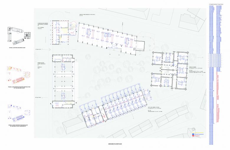 For the continued development of the buildings we are sourcing materials from a component repository—another building scheduled for demolition. This source building is located near the target site and is also owned by the city of Hanover. The components were scrutinized for reuse and will be incorporated into in combination with new materials.