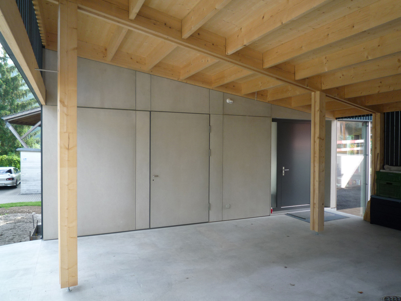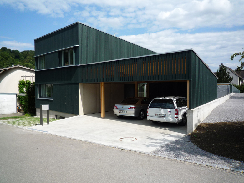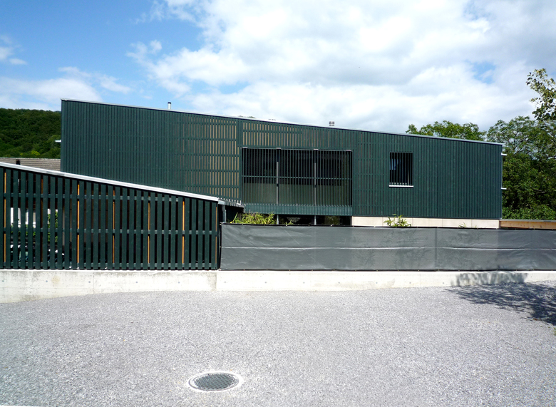 Die Unterkellerung und eine abgetreppte Bodenplatte in Beton bilden den Sockel für die zweigeschossige Holzkonstruktion mit Aussenverkleidung. Eine tannengrüne Holzverkleidung aus sägerauen Fichtenbrettern mit unterschiedlich breiten Zwischenräumen umhüllt das Gebäude und die überdeckten Aussenräume. Die Bretterverschalung dient als Sicht- und Sonnenschutz, löst sich vom Hauptvolumen und bildet Räume. Das rohe Material nimmt den Dialog mit vorhandenen bäuerlichen Architekturen auf, und setzt mit einer präzisen Detaillierung einen markanten Akzent.
