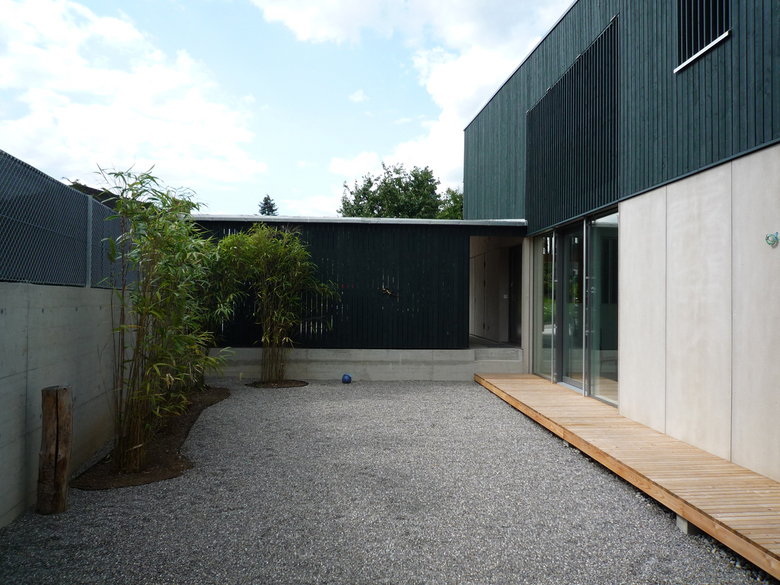 Der Bauplatz zeichnet sich durch stark unterschiedliche angrenzende Räume aus - gegen Westen prägt die Rückseite eines bäuerlichen Gehöftes die Zugangsseite zum Haus, gegen Süden und Osten befindet sich der verträumte Garten mit Obstbäumen und Weitblick zum Rhein -. Das Gebäude mit den angelagerten Aussenbereichen verstärkt und verbindet diese. Zwei gedeckte Aussenräume binden das Haus an die westliche Parzellengrenze. Zwischen Haus und Geländemauer entsteht ein hofartiger Gartenraum.