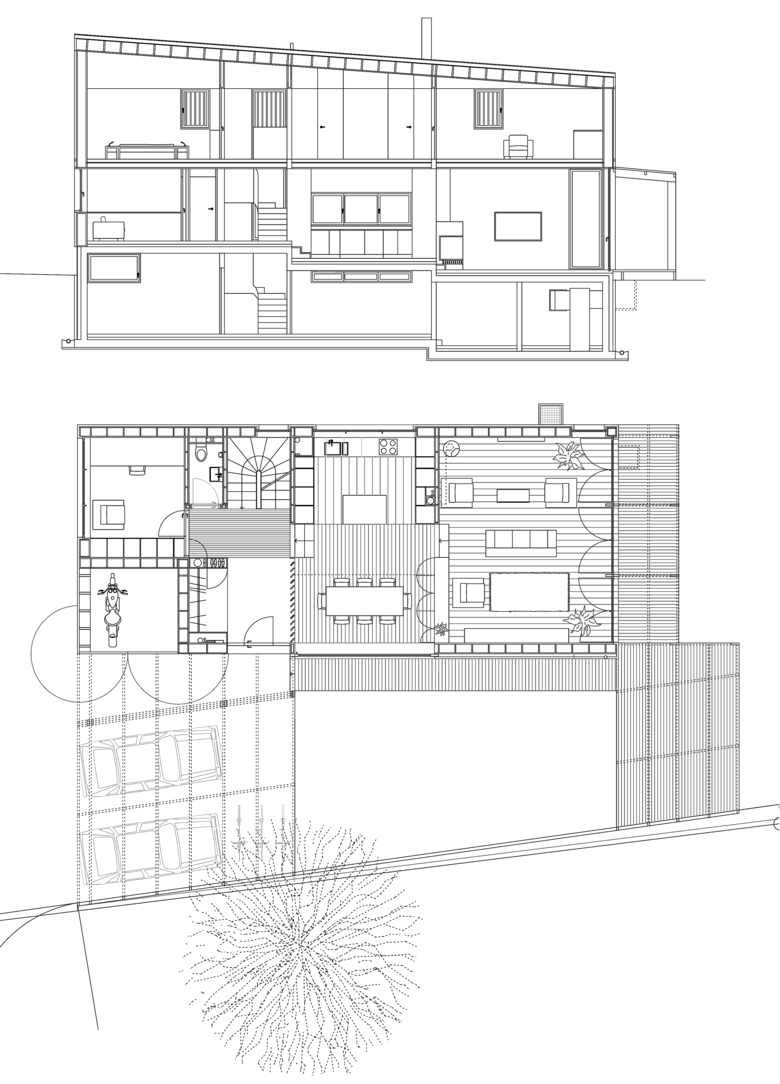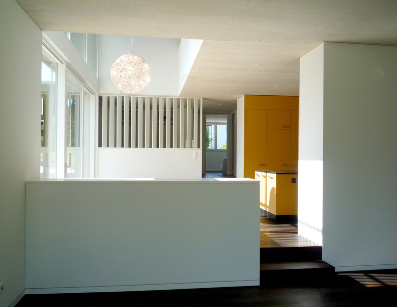 Man betritt das Haus über den gedeckten Vorplatz – mit Car-Port für zwei Autos, Platz für Fahrräder sowie einem `Schopf` für das Motorrad - in eine grosszügige Eingangshalle. Dem leicht abfallenden Terrainverlauf folgend, entwickelt sich ein offenes Raumkontinuum über die Küche und den Essraum zum Wohnraum und zum Garten. Der Essraum und die Treppe vermitteln als überhohe vertikale Räume ins Obergeschoss mit den Schlafräumen und zwei Badzimmern.