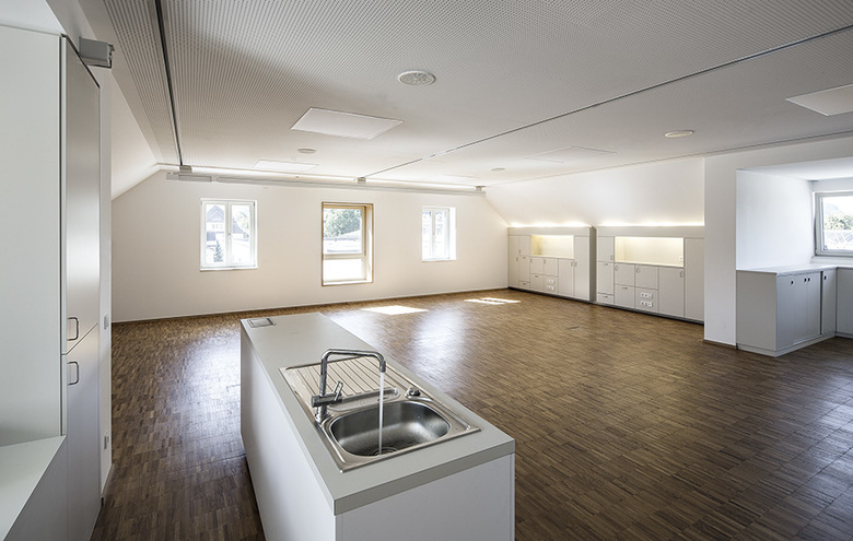 Auf der Hofseite schließt in allen Geschossen ein Verbindungsgang an den Neubau an. Das Dachn wurde komplett entfernt und als Holzbau mit großen, raumbildenden Gaupen neu aufgesetzt. Dort sind heute die zwei Pflegeoasen untergebracht. Sie nutzen den hohen Dachraum für die offenen Räume der beiden Stationen.