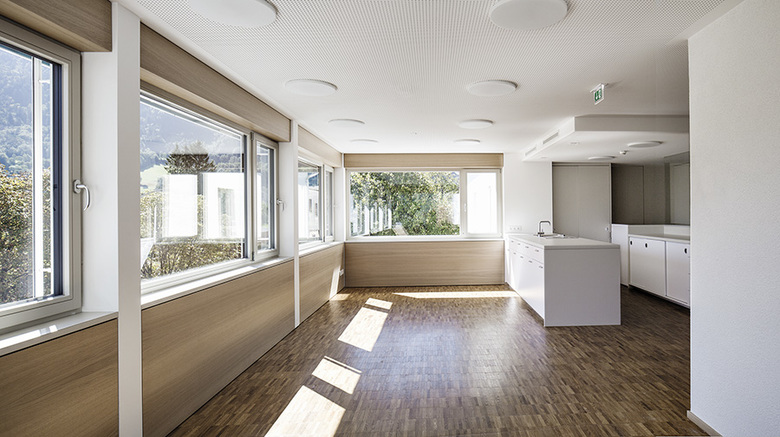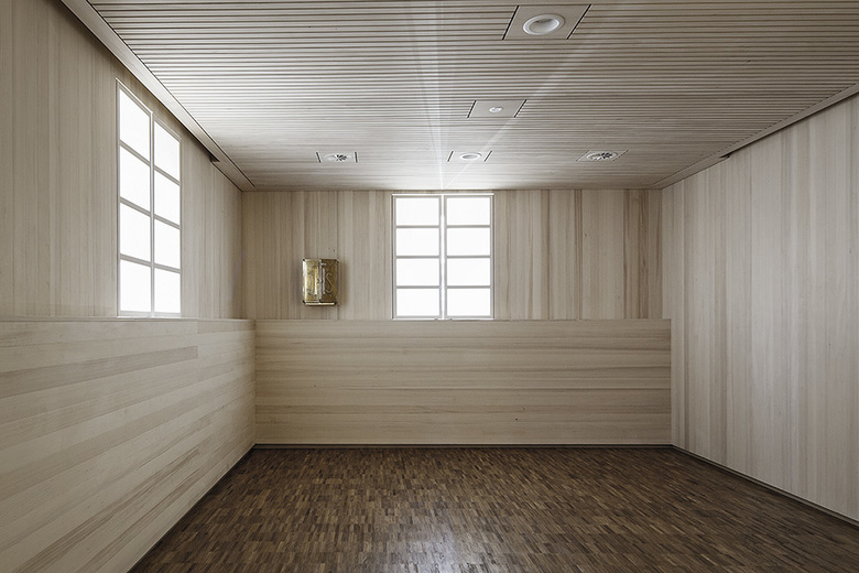 Die Materialisierung im Inneren signalisiert Wohnlichkeit. Holzböden, verschiedene Weißtöne und pastellige Helligkeit im Gangbereich. Der Andachtsraum aus dem Bestandsbau, der für viele Menschen noch Erinnerungswert besitzt, wurde an derselben Stelle wieder komplett mit Holz verkleidet und schafft mit seiner Oberfläche aus Weißtanne einen ruhigen und besinnlichen Bezugspunkt.