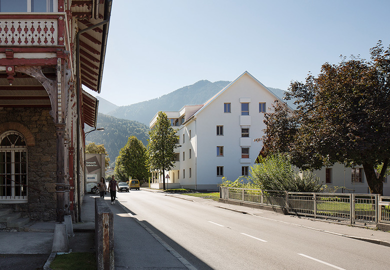 Alle Anbauten sprechen hinsichtlich Material und Struktur dieselbe Sprache und setzen sich vom bestehenden Massivbau ab. Eine weiße, glatte Aluminiumfassade, mit einer geschossweise versetzten Pfeilerfolge setzt sich ab von der rauen Putzfassade des Massivbaus. Weiß in Weiß, ein Spiel von Licht und Schatten. Repräsentativ zur Straße hin und als stabiler Kontrast zur Holzfassade des Neubaus. Alt und Neu bilden einen kleinen Hof um den Eingang des Neubaus.