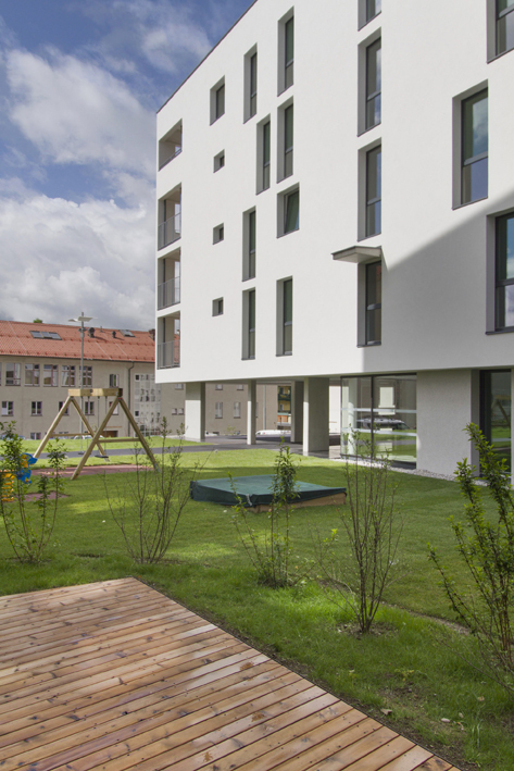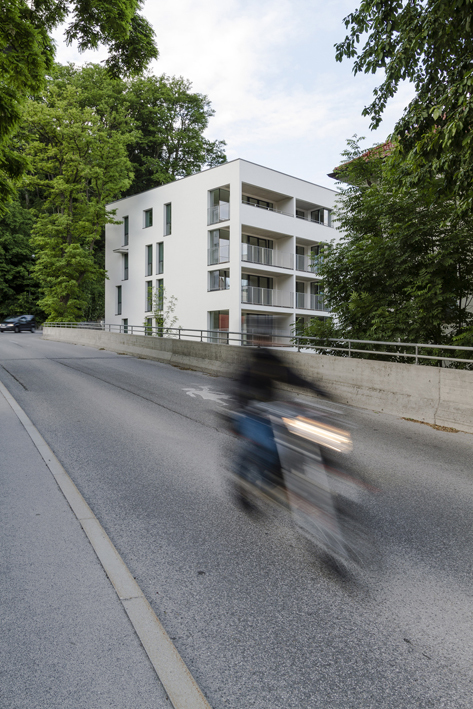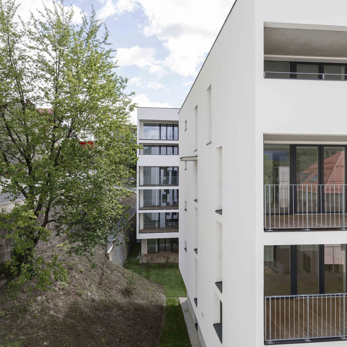 Die Straßenfassade als Scheiben mit aleatorisch verteilten Öffnungen, die Gartenfassade mit einer vorgestellten Balkonschicht, analog zu den alten Holzveranden. Kräftige, selbstbewusst freistehende Körper, die sich in präziser Reaktion auf die Umgebung anordnen. Durch die versetzte Anordnung „umspült“ der neue kleine Park die Häuser und schafft so größtmögliche Privatheit für die Wohnungen. Die 3 Bauten strahlen Individualität und hohe Lebensqualität aus. Von der sich aufdrängenden städtebaulichen Geste, einen „Hof“ mit dem Priesterseminar zu schaffen wurde –wegen der fehlenden inhaltlichen Kongruenz- bewusst Abstand genommen. Wohnen und geistliche Verwaltungsarbeit in harmonischem Nebeneinander, verbunden durch das Konzept des kleinen Parks.