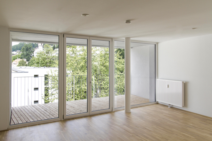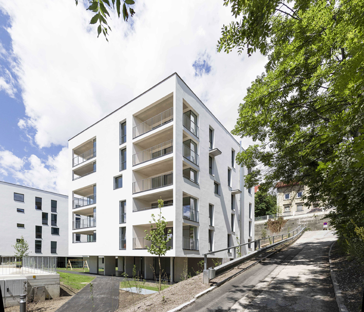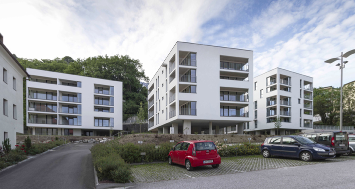 Sind in kompakten 3 Spännern organisiert. Sie haben immer zwei Fassaden oder Südorientierung, die vorgestellten Veranden ergeben intime, akustisch abgeschirmte private Freibereiche. Im inneren wurde auf optimale Nutzbarkeit Wert gelegt. So kann in den meisten Fällen bei Bedarf ein „zusätzlicher individual Raum“ bei Beibehaltung einer Wohnküche abgeteilt werden. Die straßenseitigen Räume erhalten Schallschutzfenster; kombiniert mit der Komfortlüftung ist die Höhenstrasse nach Abklärung mit dem Bau-Akustiker durch diese Maßnahmen kein Problem.
