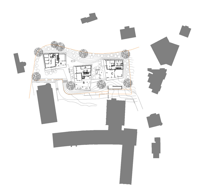 Durch die Lage im geneigten Gelände bietet sich an, den fußläufigen Zugang konsequent von Süden her zu organisieren. Eine „Familie von Eingängen“ liegt an der leicht angehobenen, halböffentlichen Übergangszone, gegenüber dem Parkplatz.