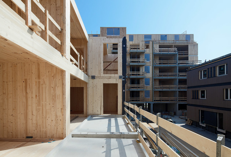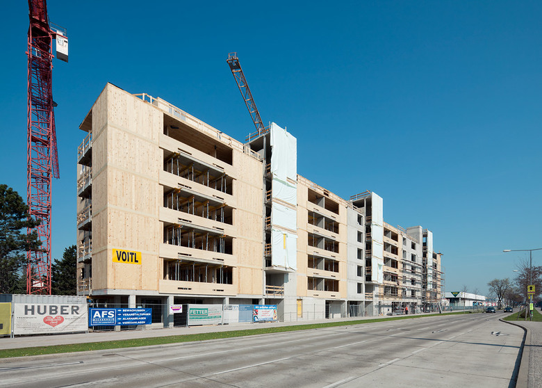 Hervorgehend aus dem Siegerprojekt „Holzbau in der Stadt“ entstand an der Wagramer Straße ein sieben geschossiger Wohnbau in Holzbauweise.