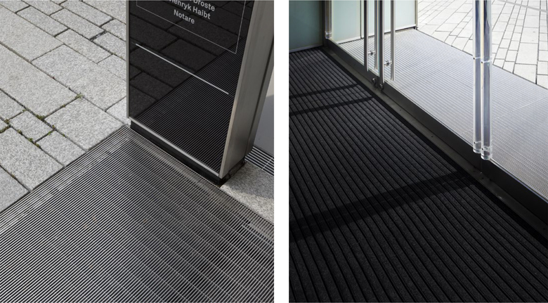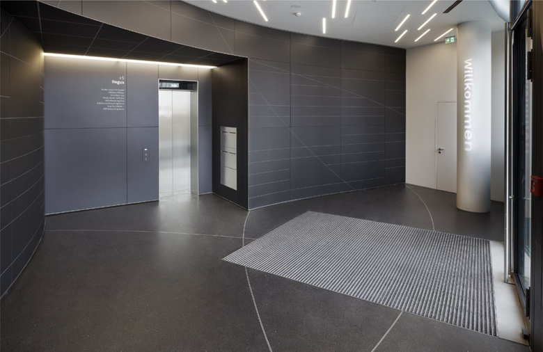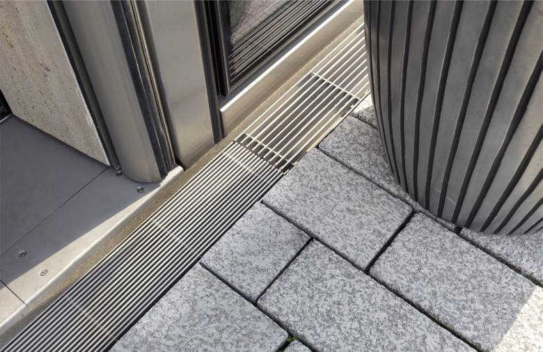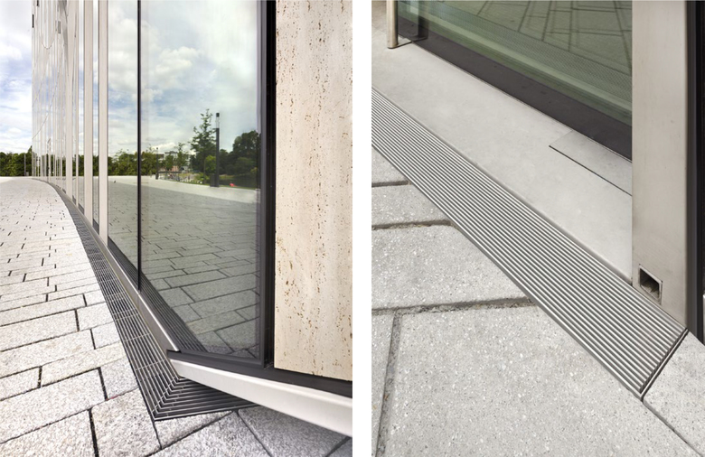 This includes unobtrusive slotted drains made from stainless steel to accentuate building outlines with their integrated illumination. Homogeneous grating design to drain the façades all around the Kö-Bogen underlines the aesthetically pleasing overall impression. In the entrance areas the bar spacing was chosen in such a way as to be kind even to stiletto heels. Furthermore, the intelligently finished surfaces of the linear gratings on the doors provide an anti-slip effect. In combination with the embedded doormats this prevents as much dust and other particles as possible from being walked in to the building.