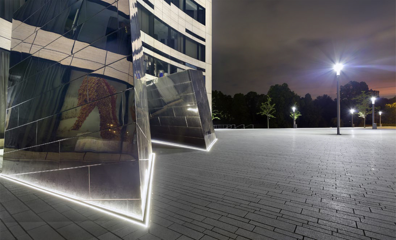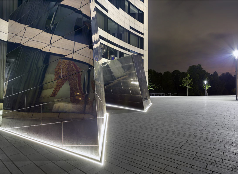 In the courtyards, which do not have illumination in the traditional sense, approximately 100 m of LED-LightLines trace the contours of the planters with a warm-white light. This results in an exceptionally harmonic bond between high tech and nature. This masterful manoeuvre is part of the overall concept: Since the bridge linking the two parts of the building is indirectly illuminated using LED-LightLines. In addition, twelve LED spotlights are used to strikingly highlight trees in planters. The result is an unusual ambience and its light mood also serves as an eye-catcher for people working in the adjacent offices.