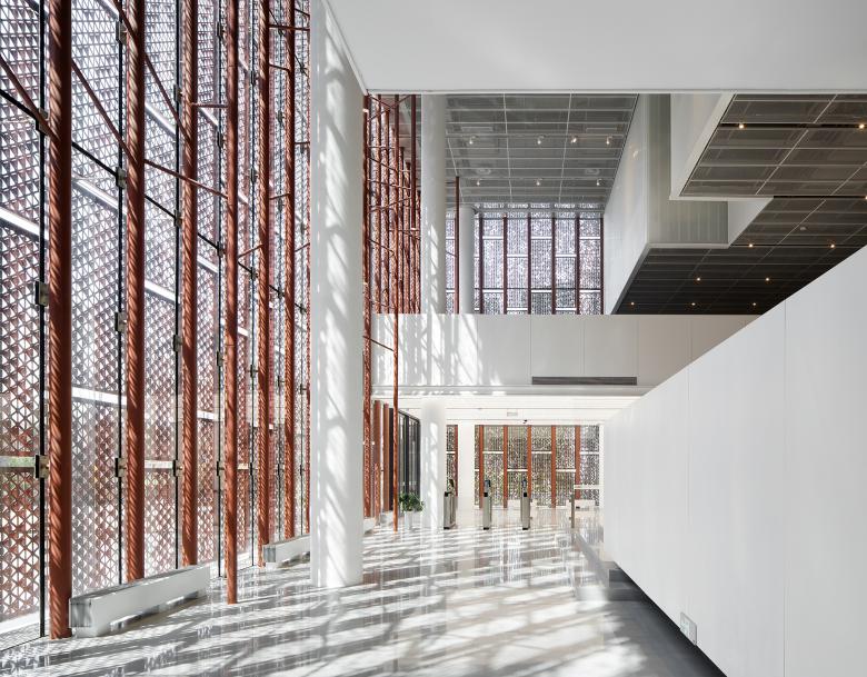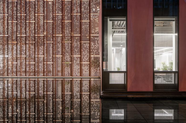 The introduction of daylight has often been considered as the soul of architectural space. In this project, we created a poetic scene of “Play of light and shadows in a bamboo forest” after navigating technological difficulties, in a bid to inject poetry into the prefabricated architecture. To realize that, we first pixilated a photo of a real bamboo forest on the computer to gain vector data, and then resorted to parametric tools to convert the textures of the bamboo forest to the building's surface. Moreover, construction robots were leveraged to ensure the varied angles of the aluminum panels' perforations, so as to control the effect of the filtered daylight and create a poetic view of "A towering bamboo forest filled with mottled light and shadows". At dusk, it provides people with a poetic experience of "watching the sunset in the shadows of bamboo", adding varying visual effects and a tranquil ambience to the space.