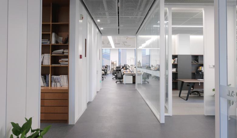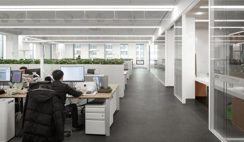 The entire building is like a three-dimensional garden that offers multiple choices of vertical traffic to access the workspace on the south and north sides, which create joyful walking experiences. The interior space is mainly finished with white coatings to achieve a bright environment, and it's conceived in a minimalist style with little decoration to seek visual coherence. The prefabricated structural columns, beams and floor minimize the volume of cast-in-place concrete. Castellated beams are employed as main beams, and major pipelines pass through them in an orderly manner, hence preserving the net height of the interior space to the maximum extent and adding a technological aesthetic to the exposed ceiling. This is a new construction mode that combines technology with art and encourages a new work approach.