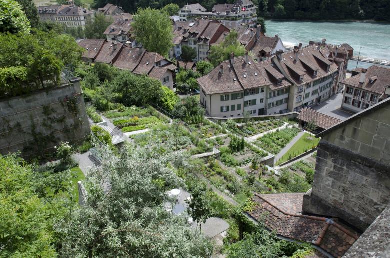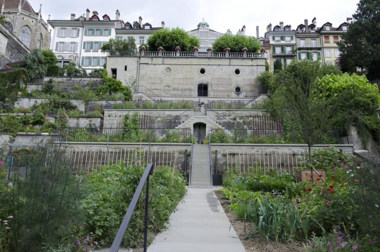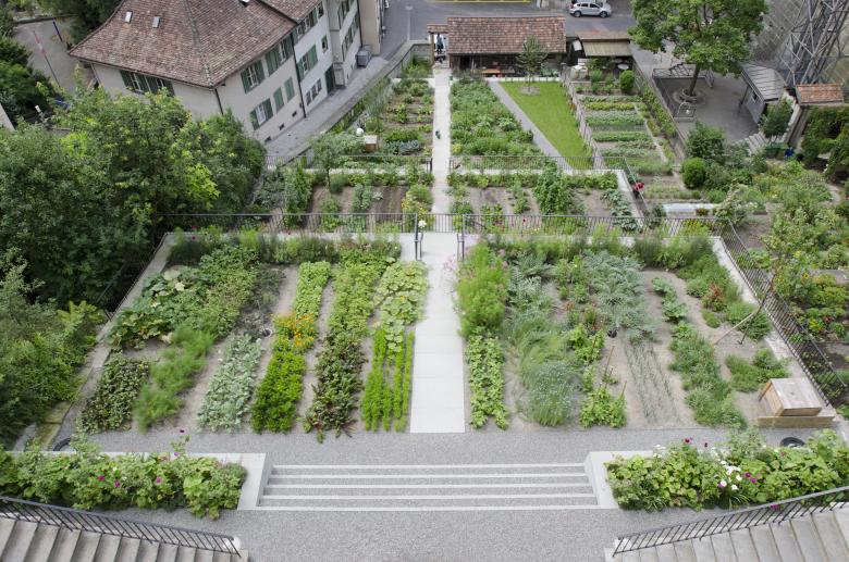Gemäss der historischen Nutzung wurden auf den unteren Terrassen wieder Nutzgärten eingerichtet. Die schutzwürdigen Strukturen mit ihren hohen Terrassenmauern haben wir möglichst behutsam saniert. Mauerabdeckungen, Treppen und Wege mussten komplett erneuert werden. Die beiden alten Platanen auf der oberen Terrasse prägen noch immer das Bild, die gesamte weitere Bepflanzung musste jedoch neu angelegt werden. Gemüse, Beeren und Blumen werden jedes Jahr von Nachbarn, einer Schulklasse und von der Bundesgärtnerei gepflanzt und gepflegt. Historische Sorten von Spalierobst bewachsen wieder die Holzspaliere an den Stützmauern. Der Garten ist öffentlich nicht zugänglich, aber von der Münsterterrasse gut einsehbar.