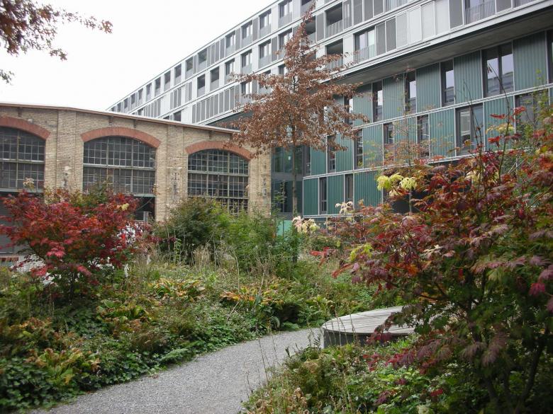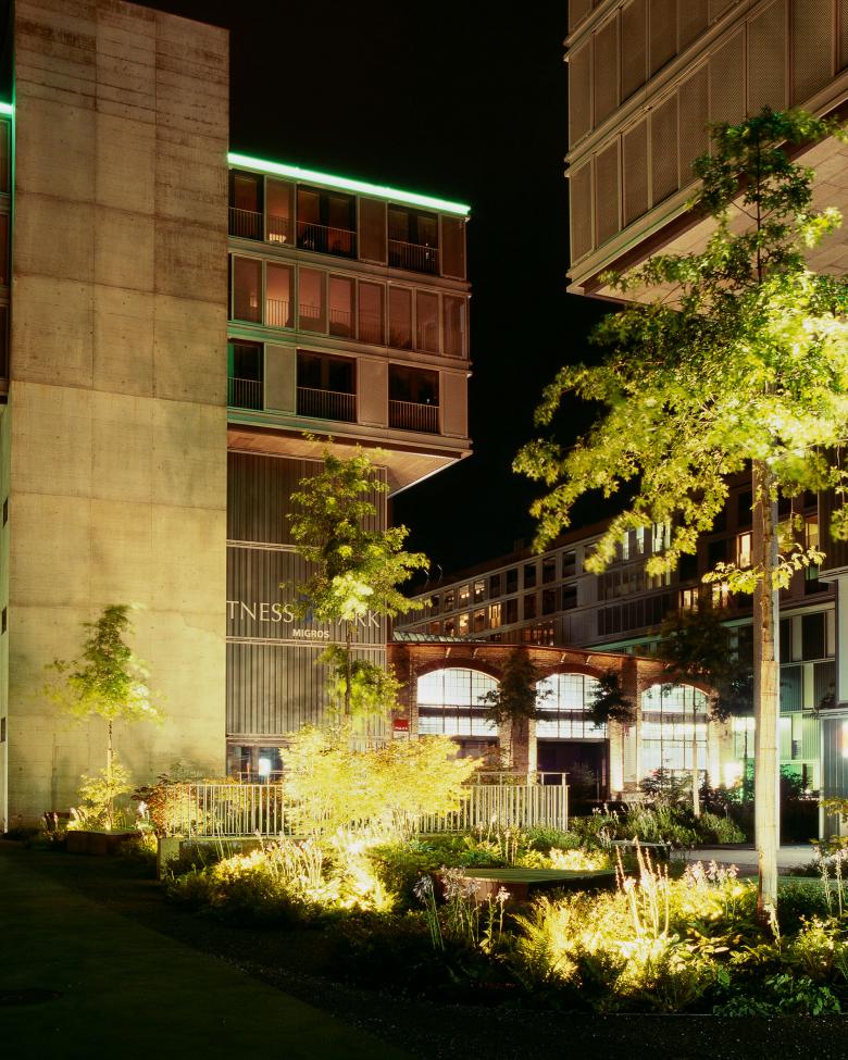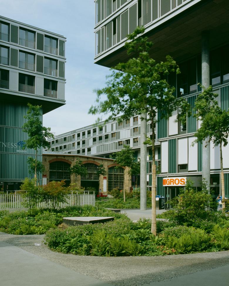 Wir lassen das Gebäude an den Längsseiten von Reihen aus hoch aufgeasteten Bäumen begleiten. In den auf der Höhe der üppigen Baumkronen liegenden Wohnungen entsteht der Eindruck, in einem Baumhaus zu leben. In Gebäudenähe sorgen Lindenhecken für kleinmassstäbliche Spiel- und Aufenthaltsräume. Die Kies-, Beton- und Asphaltbeläge machen die ehemaligen Industriebrache spürbar. Im spannenden Kontrast zur industriell geprägten Aussenwelt bilden im dschungelartigen Innenhof üppige Pflanzeninseln mit grossen Holz-Sitzmöbeln eine wohltuend grüne Oase. Mit «Puls 5» ist in Zürich-West ein weiterer besonderer Ort mit einem ganz speziellen Mikroklima entstanden.