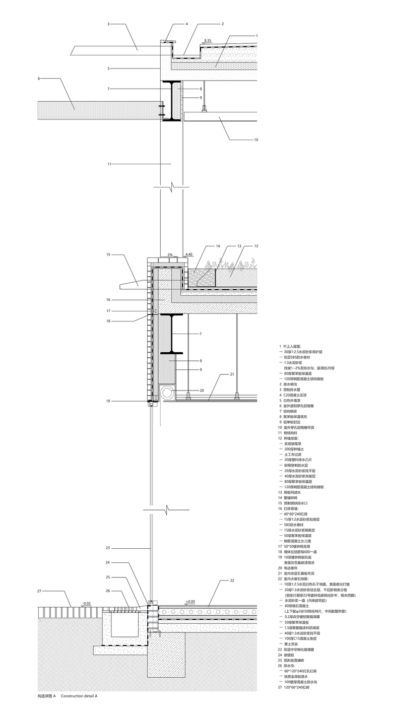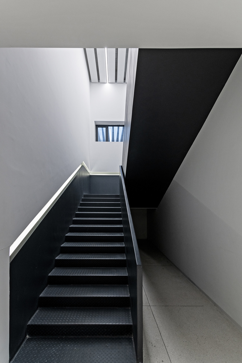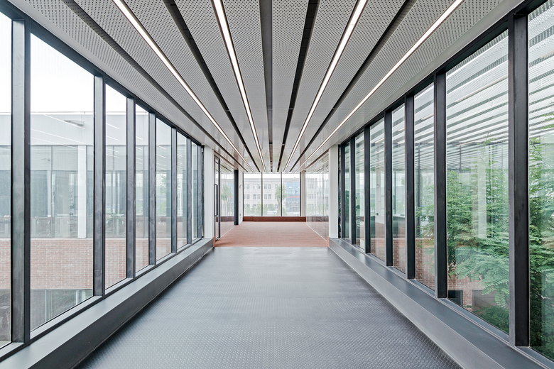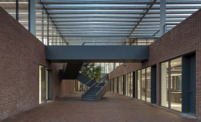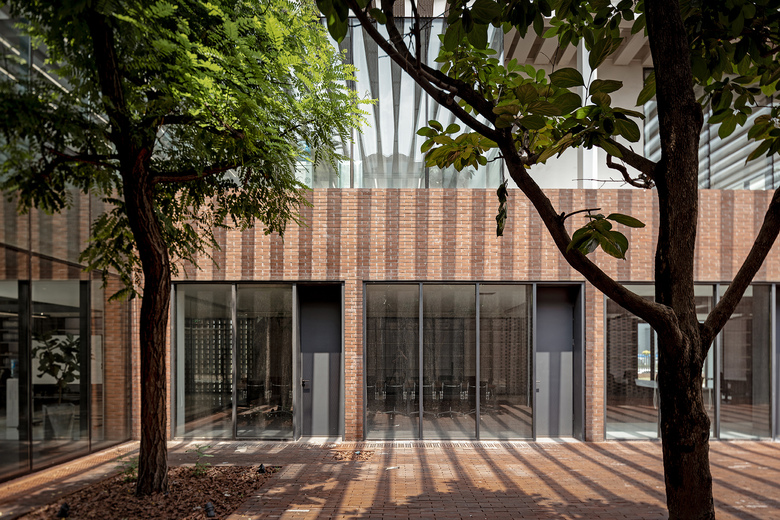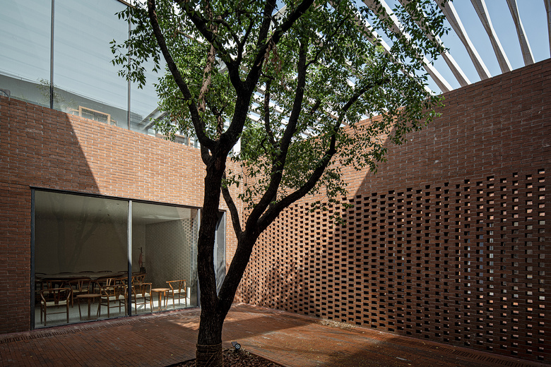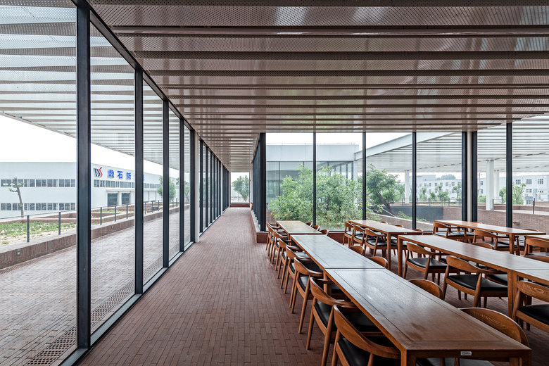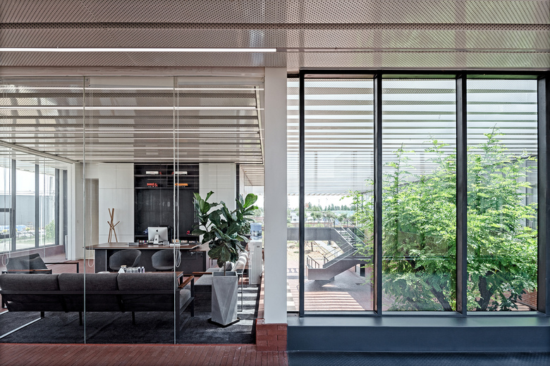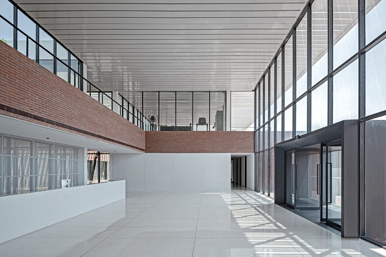 The office building is characterized by a restrained material palette, which focuses on the logic relationship between materials and space, integration between interiors and exteriors, as well as maximum expression of material languages. The front court, external walls of 1F, and part of the floor on 2F, are clad in red bricks, a type of material commonly seen on local historical architectures. From south to north, the red bricks together present an undulating image based on the architectural form. According to positions, space openings and functional requirements, bricks were laid in different ways, and hence presenting various formations and visual effects. Apart from bricks, steel materials were also repeatedly utilized, which can be found on indoor and outdoor bridges, staircases, door and window frames, and some counter surfaces within the space. Besides, work was done to endow part of the outdoor floor with slip-resistant quality. On 2F, perforated aluminum grilles were used as ceilings of interior spaces and covers of outside areas. Those grilles hide pipes and wires of lighting system, air conditioning and other equipment, which ensures the integrity of spatial interfaces and forms contrast with rough brick surfaces as well.