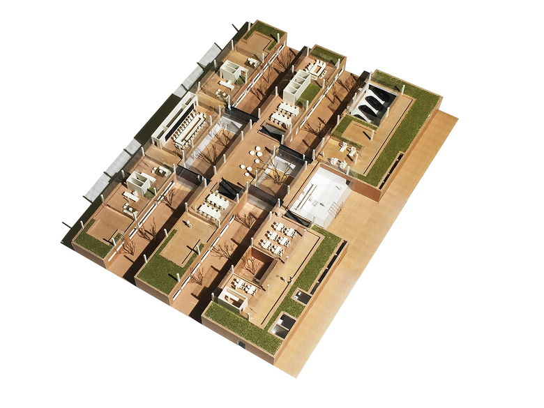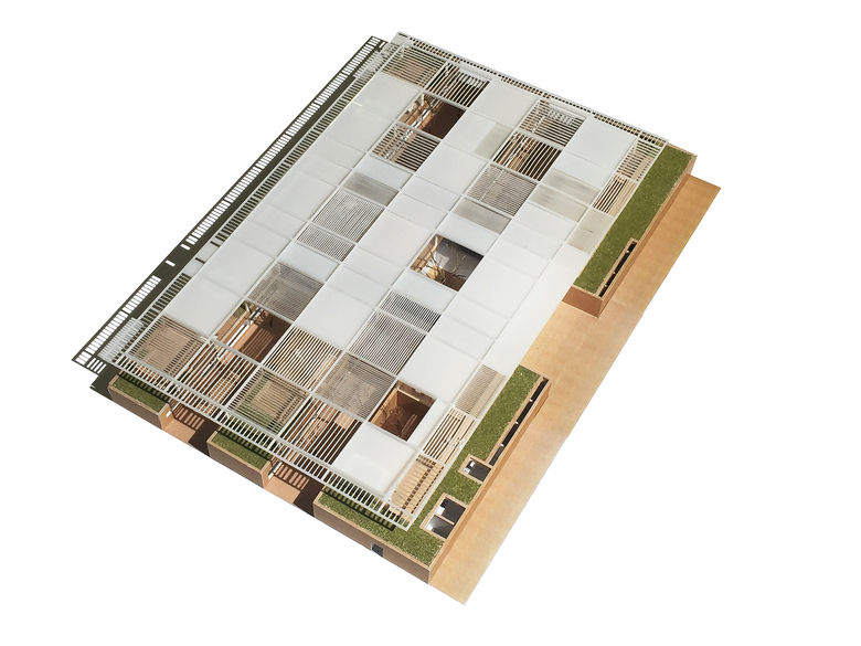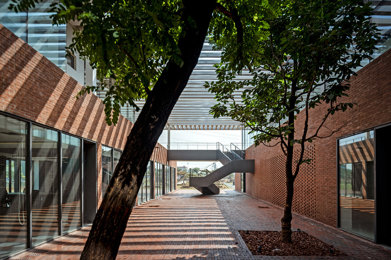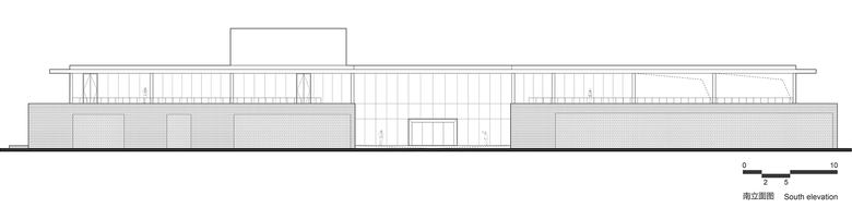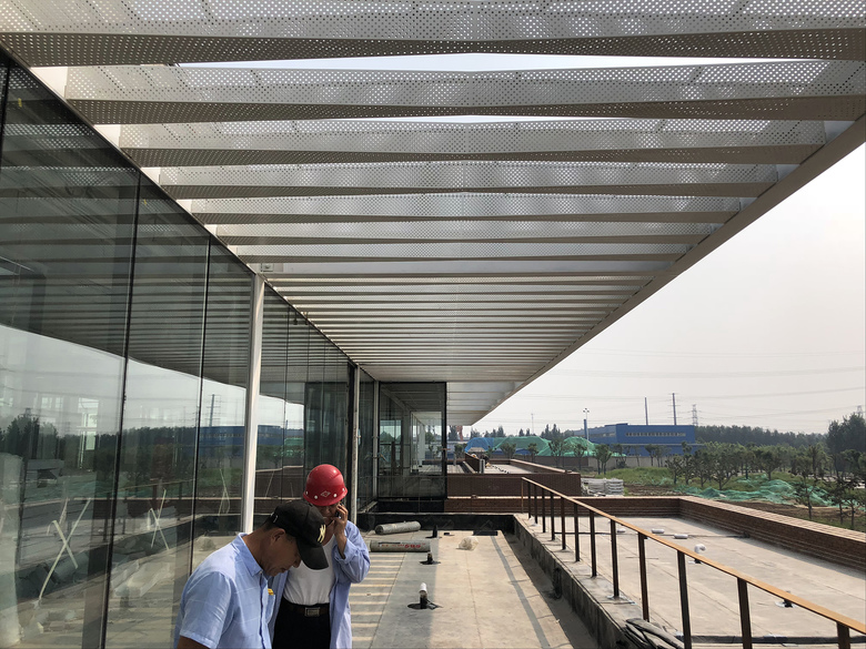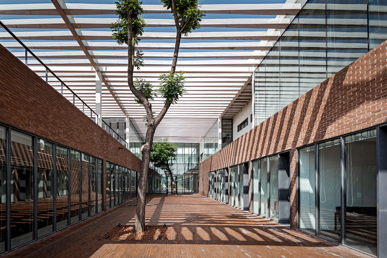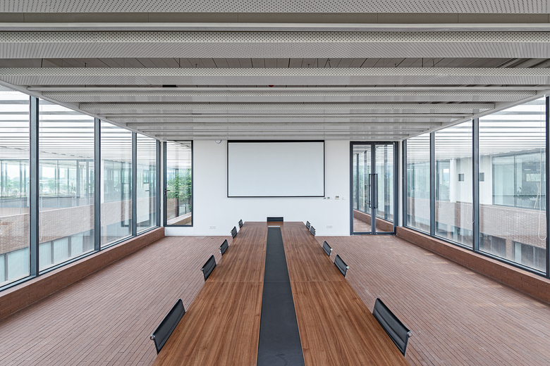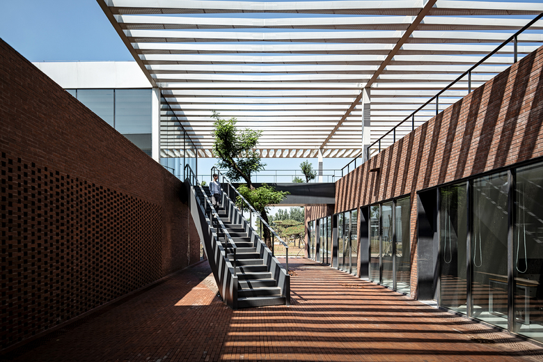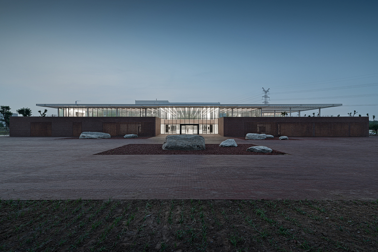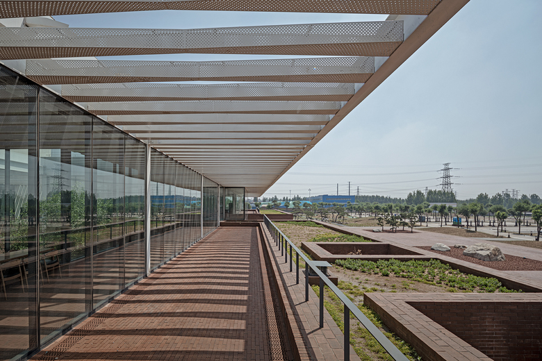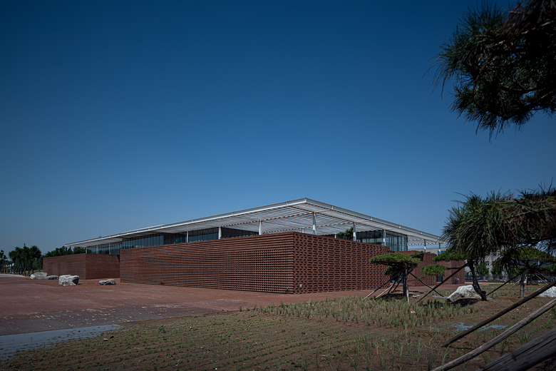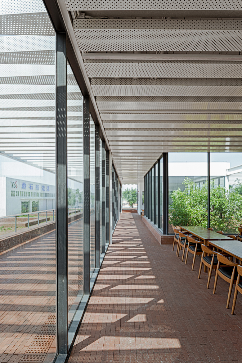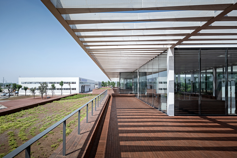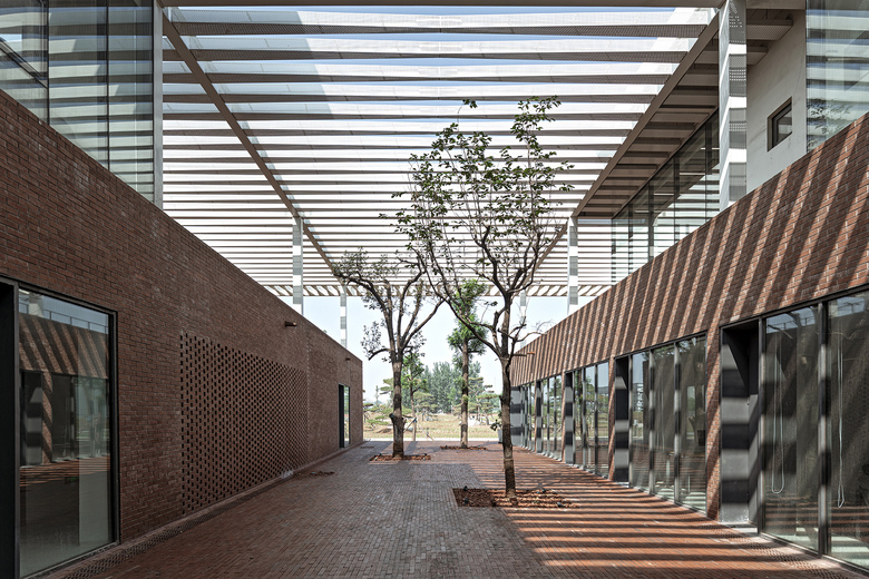 The entire architecture is covered by a 4,000-square-meter flat roof and sun-shading grilles formed by aluminum strips. The grilles draw on the linear forms of surrounding farmland, and soften floor slabs. From the building's middle area to east and west sides, the interspace between aluminum strips gradually decreases. Besides, each aluminum strip features width variations and perforated surfaces. The steel-structured rooftop of the three architectural blocks and the sun-shading grilles together constitute an integrated large roof. It looks like a lampshade with interspaces, which allows light to filter down, and thereby turning the building and courtyard beneath into a "forest" of light and shadows. The varying light brings changes to spaces throughout the day. The rhythmic interplay of light and shadows, as well as human activities, together produce distinctive vivid scenes.